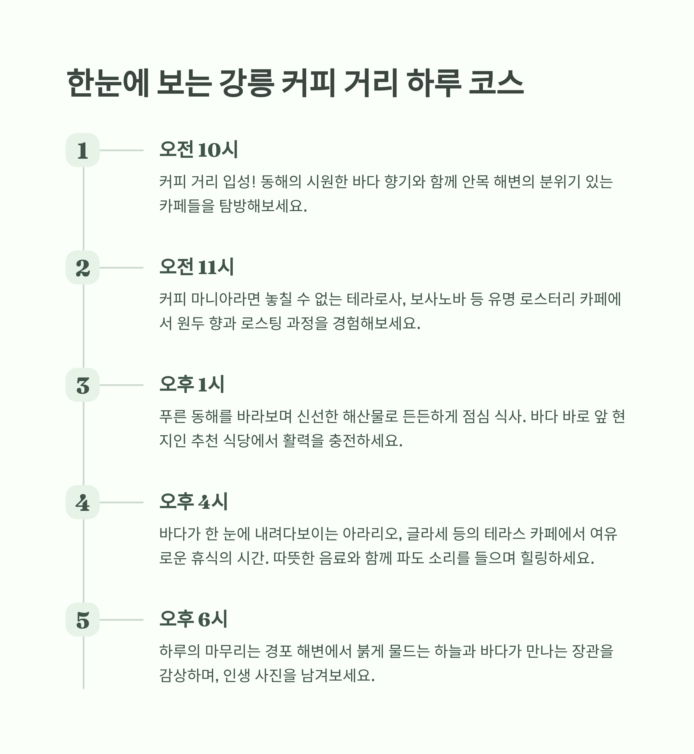 | 오전 10시 | 커피 거리 도착 및 카페 탐방 | 안목 해변 |