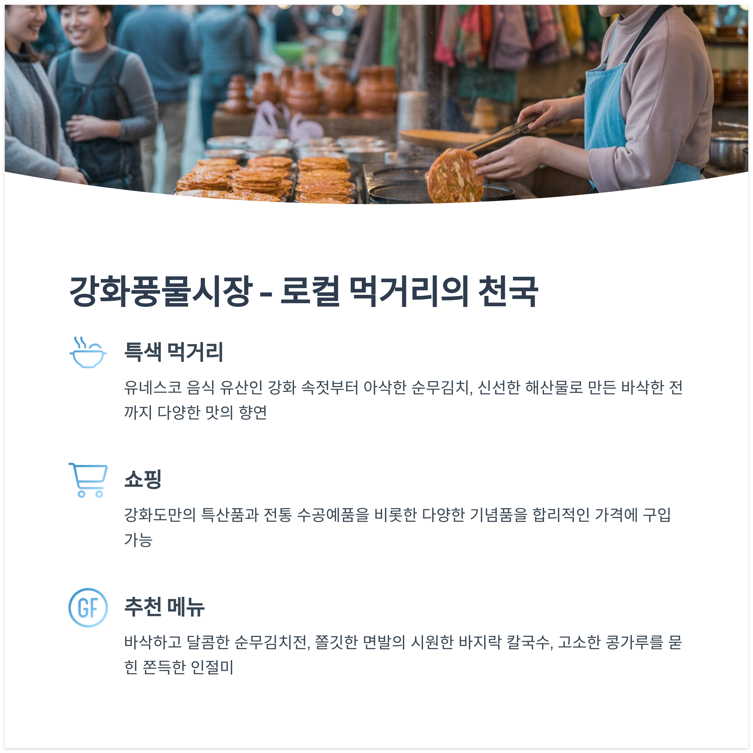 강화 속젓, 강화 순무김치, 해산물 전 등 특색 있는 로컬 먹거리가 많아