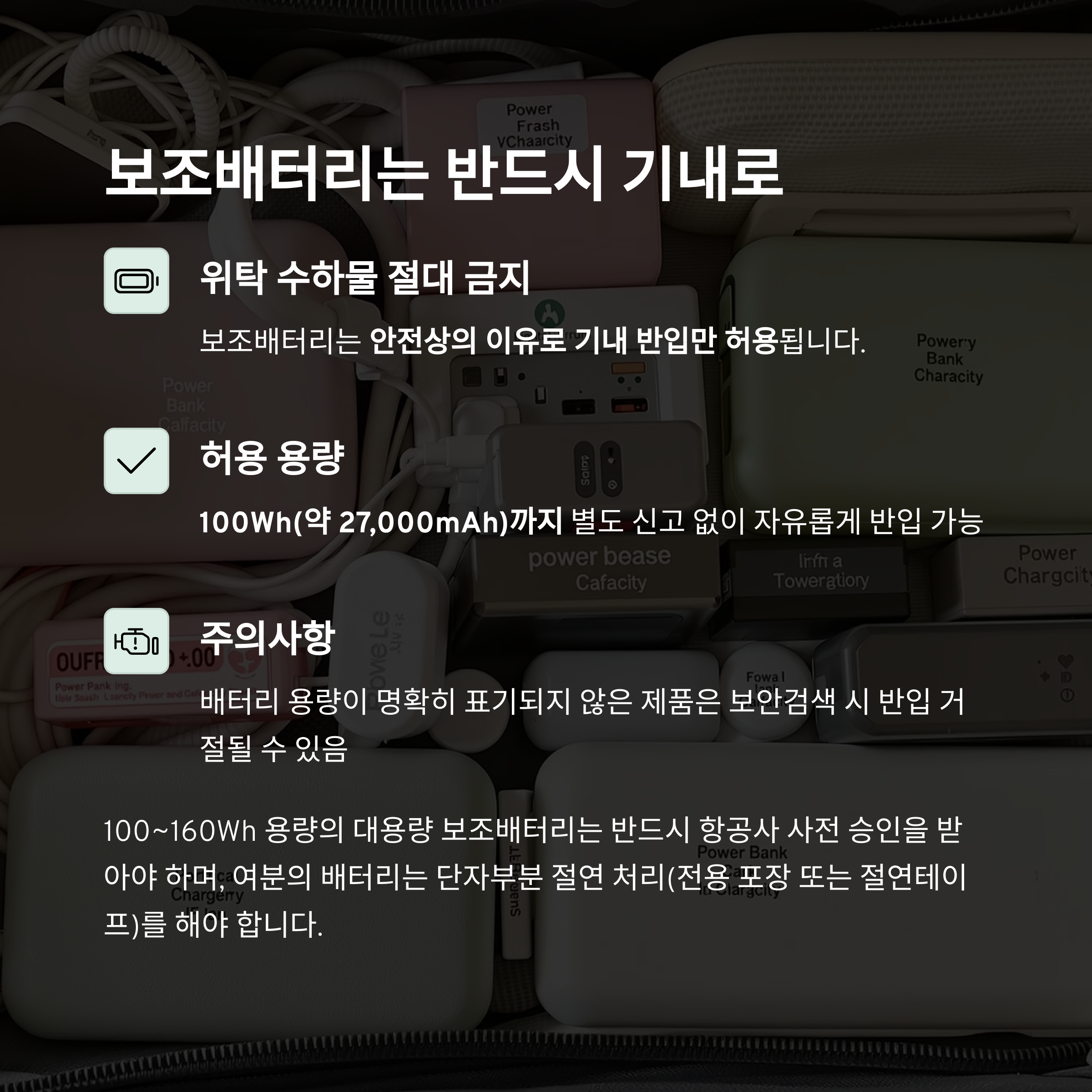 | 반입 가능 | 최대 100Wh 이하 보조배터리 (대부분 일반 제품 가능) |