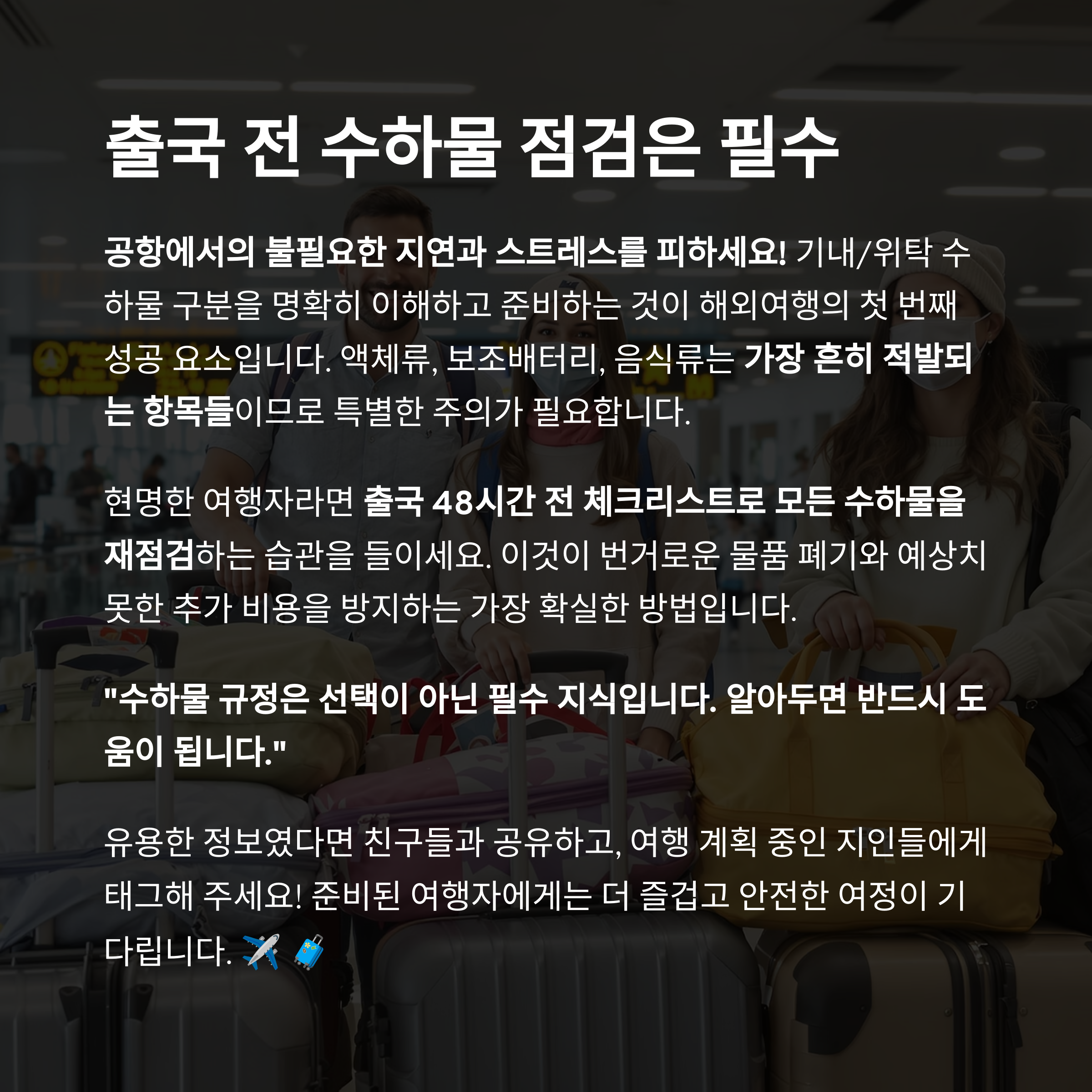 기내/위탁 수하물 구분을 정확히 이해하고 준비해야 합니다.