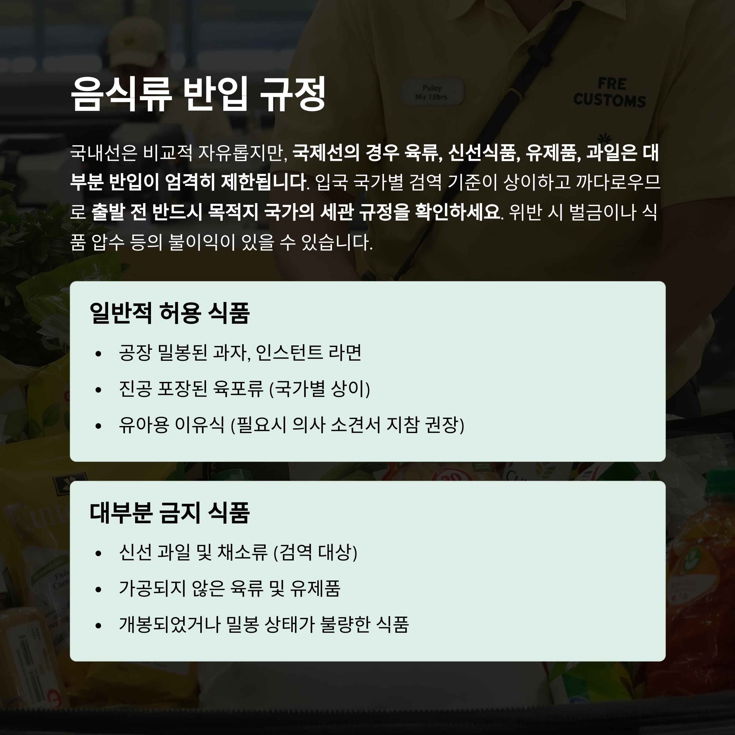 국제선의 경우 육류, 신선식품, 유제품, 과일은 대부분 반입 금지입니다.