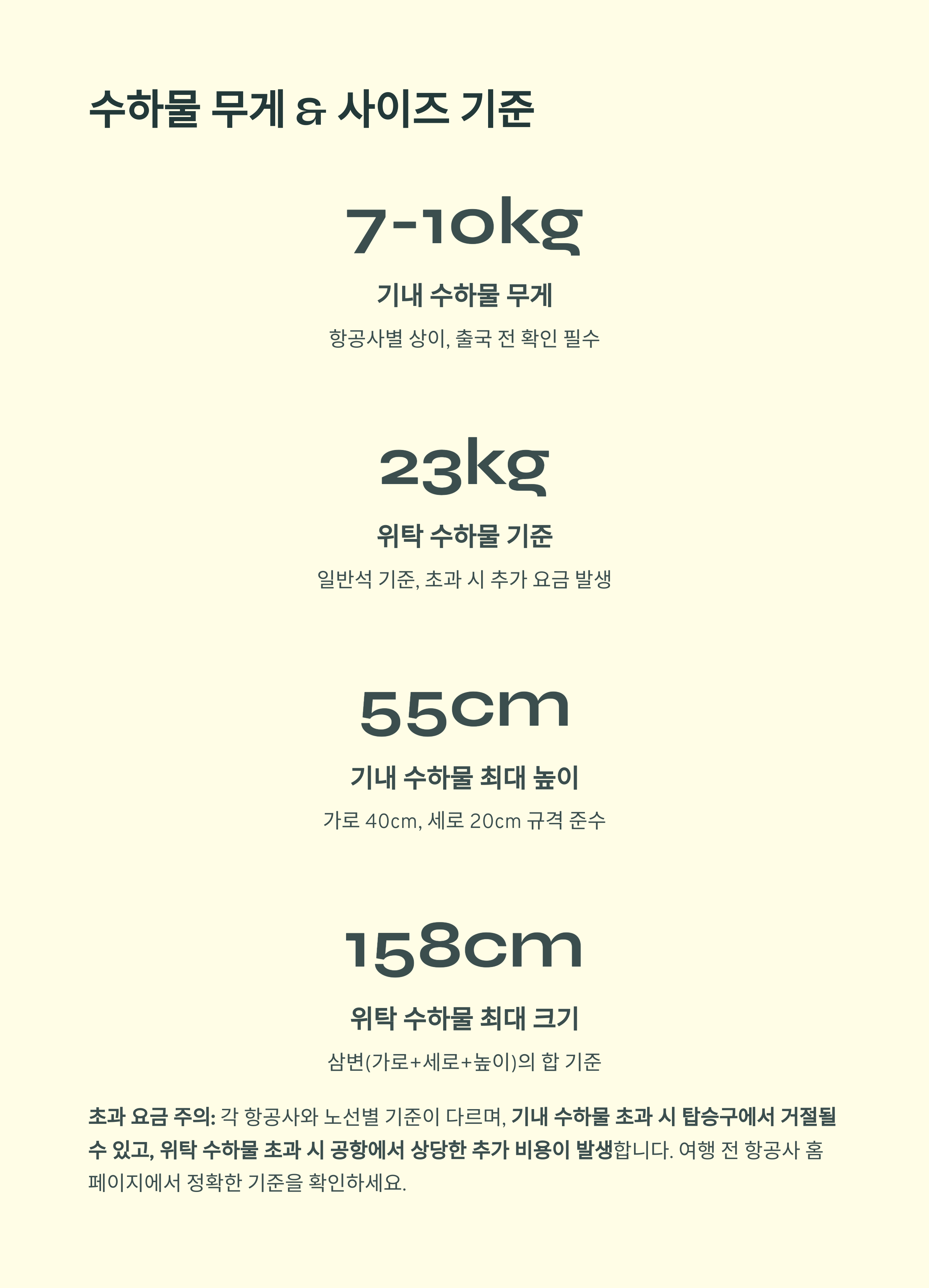| 위탁 수하물 | 23kg 기준 (항공사별 상이) | 158cm 이하 (삼변 합계) |