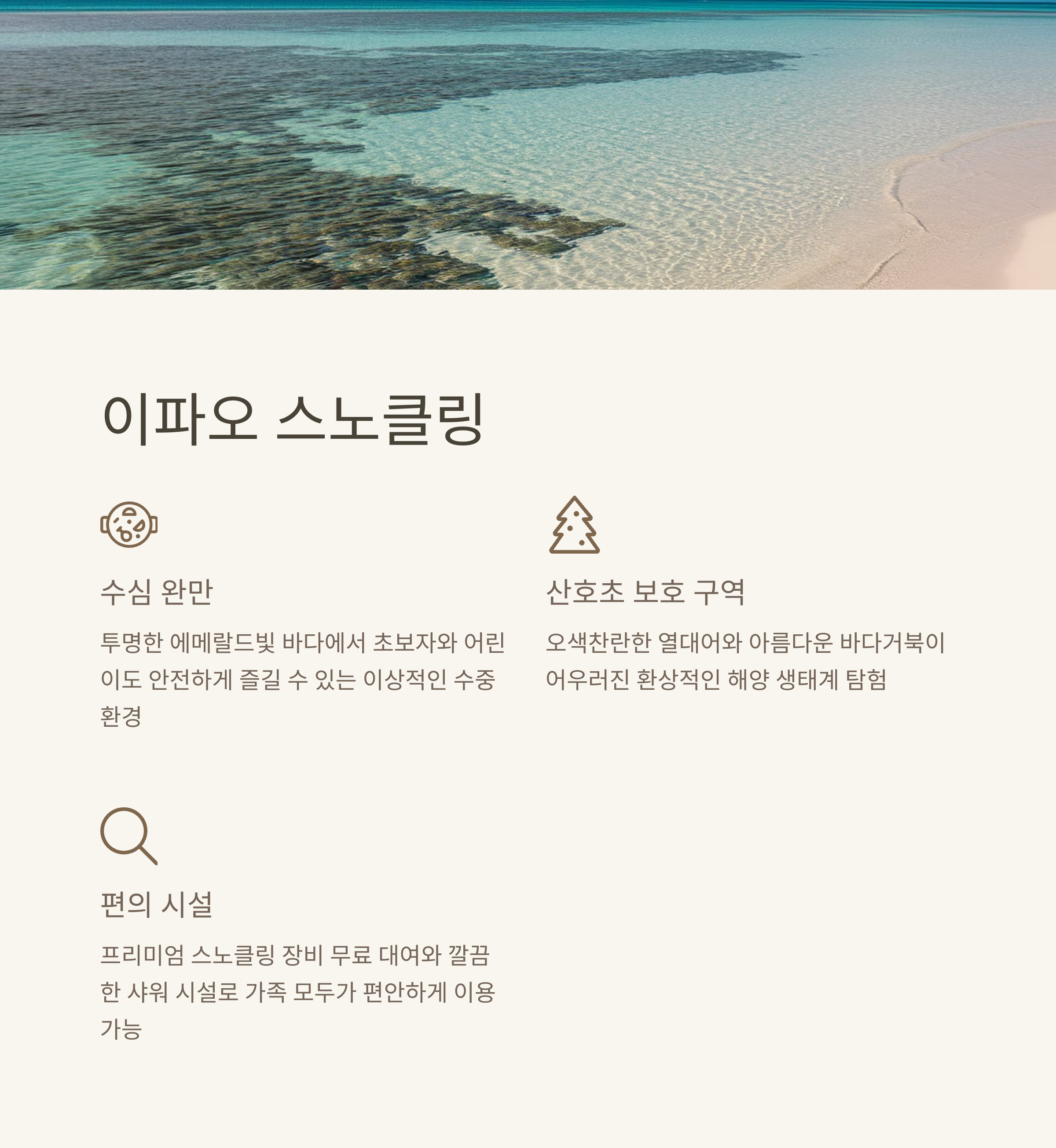 맑고 투명한 바닷물, 고운 백사장, 부드러운 파도 소리.