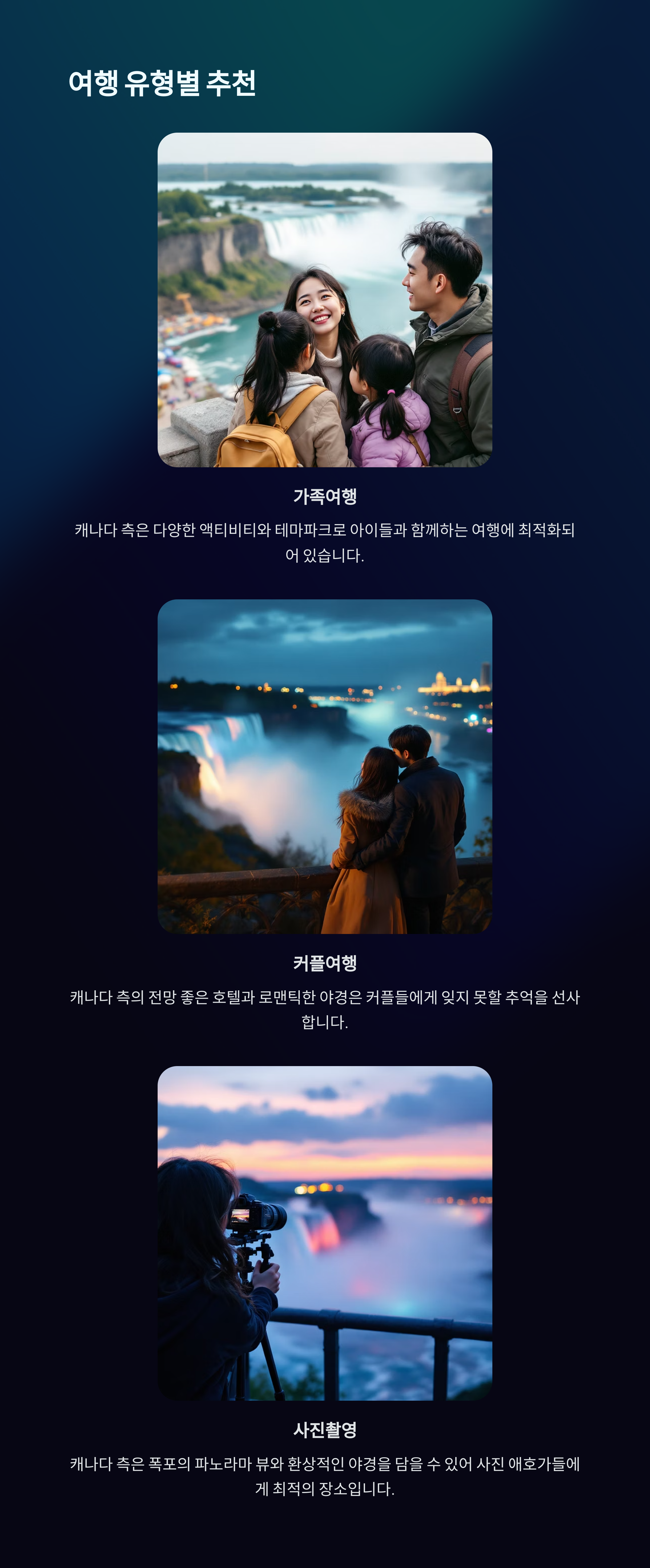 | 가족여행 | 캐나다 | 다양한 액티비티와 테마파크, 식당 편리 |