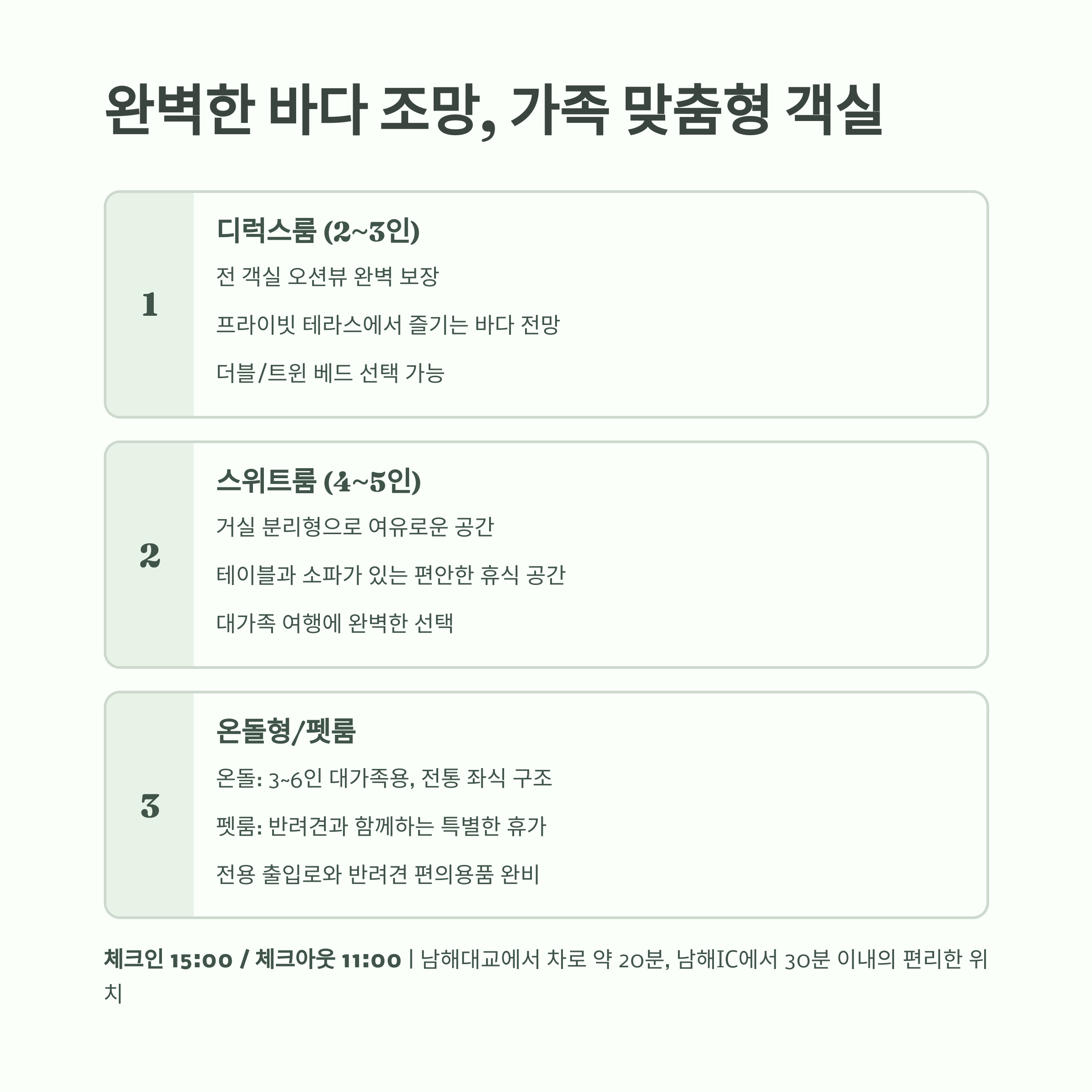 | 패밀리온돌형 | 3~6인 | 좌식 전통 구조, 어린 자녀나 어르신 동반 시 추천 |