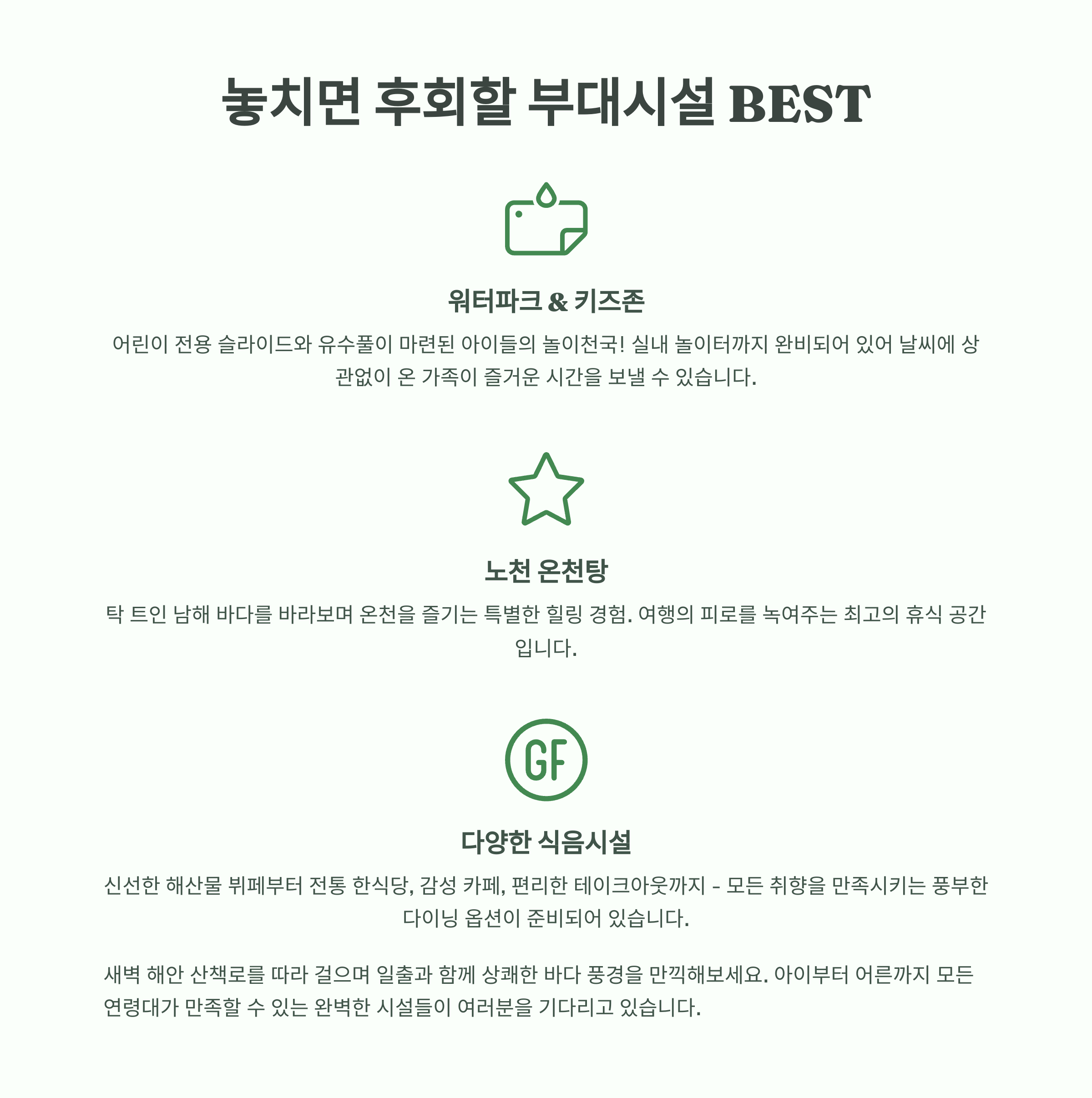 아이부터 어르신까지 모두 만족할 수 있는 시설과 주변 관광지가 함께 어우러져 있어요.