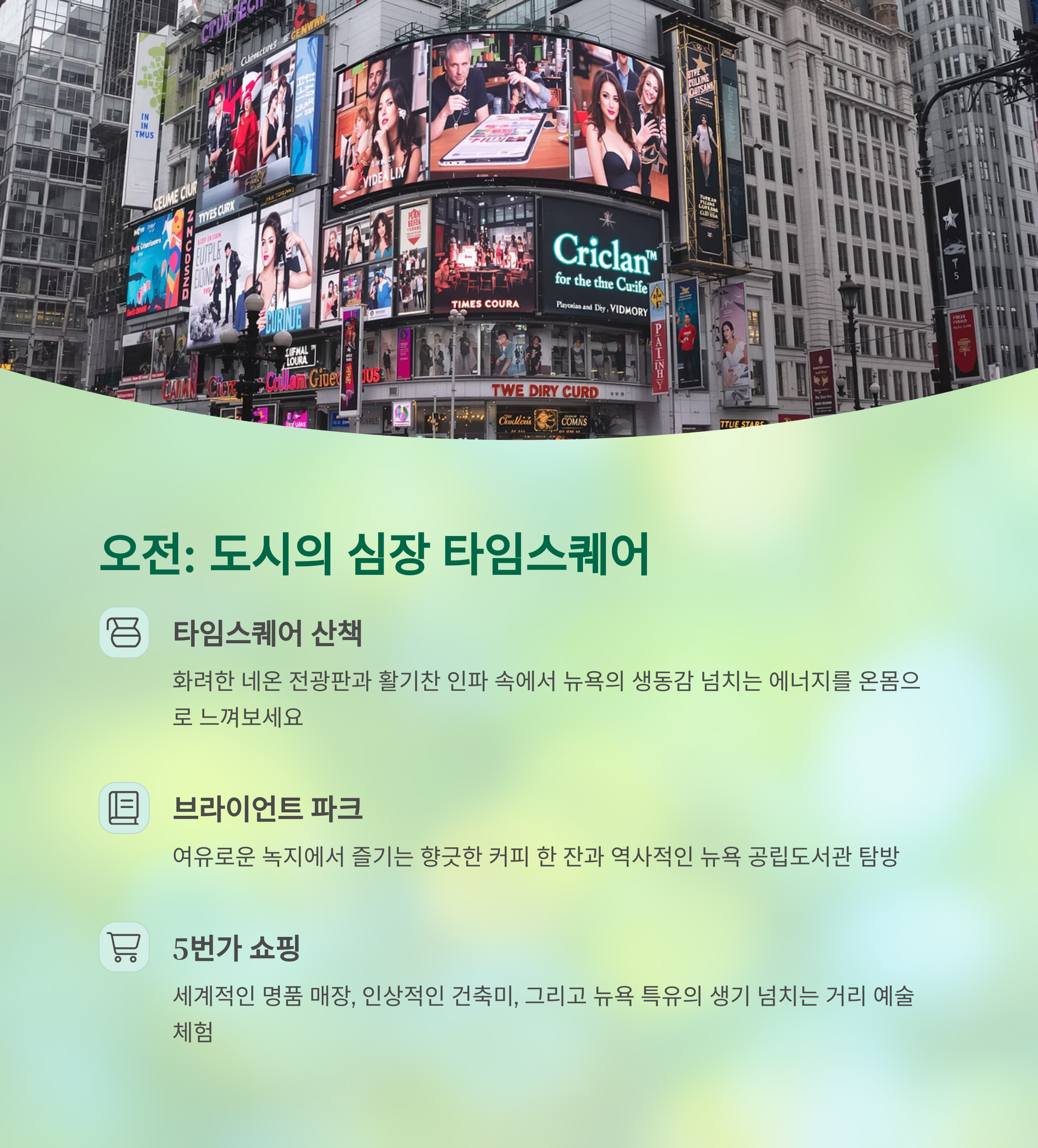 | 오전 | 타임스퀘어, 5번가 | 산책, 커피, 거리 감상 |