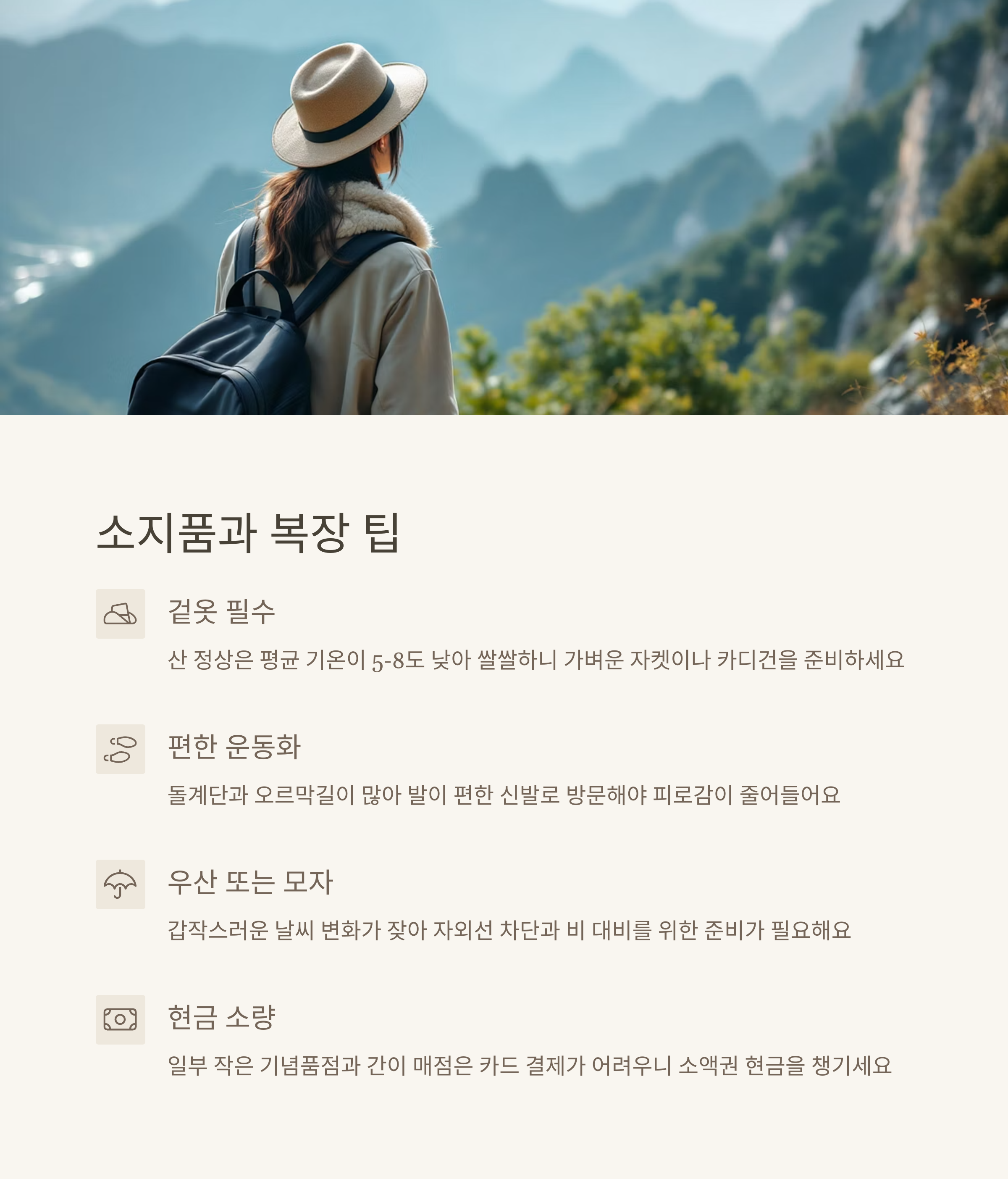 - 겉옷 필수: 정상은 기온이 낮아 쌀쌀할 수 있어요.