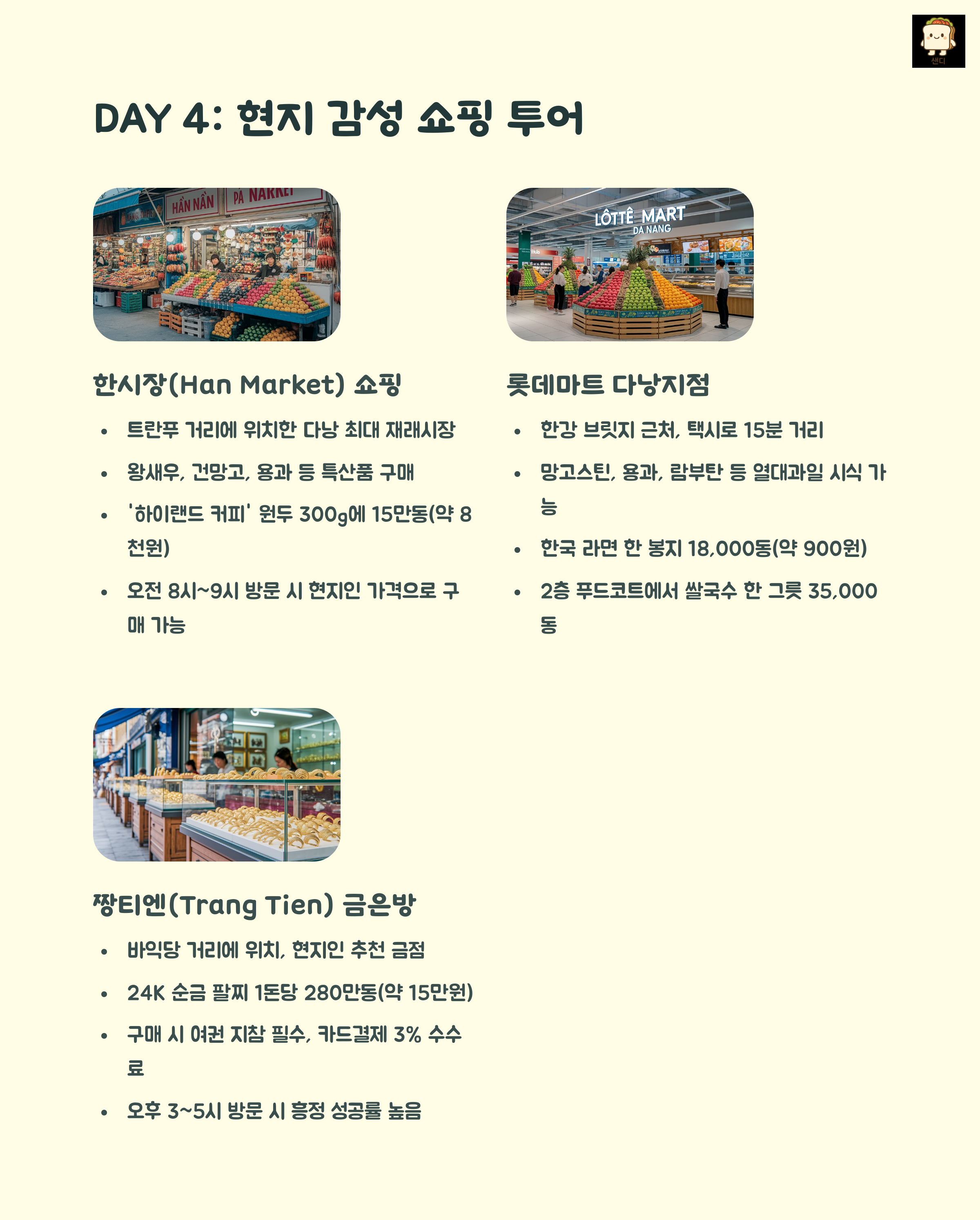 | 4 | 한시장 & 귀국 준비 | 기념품 쇼핑 + 마무리 |