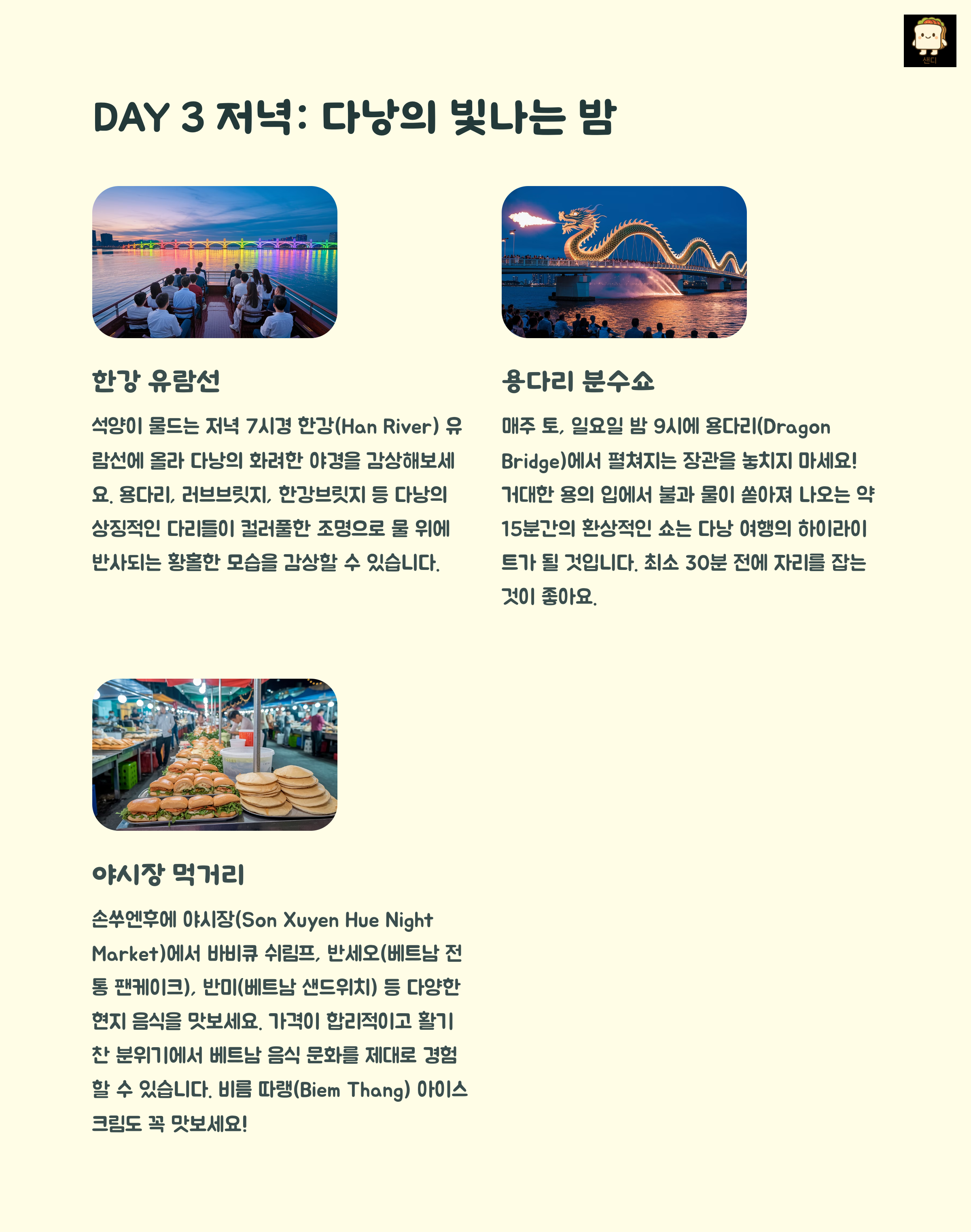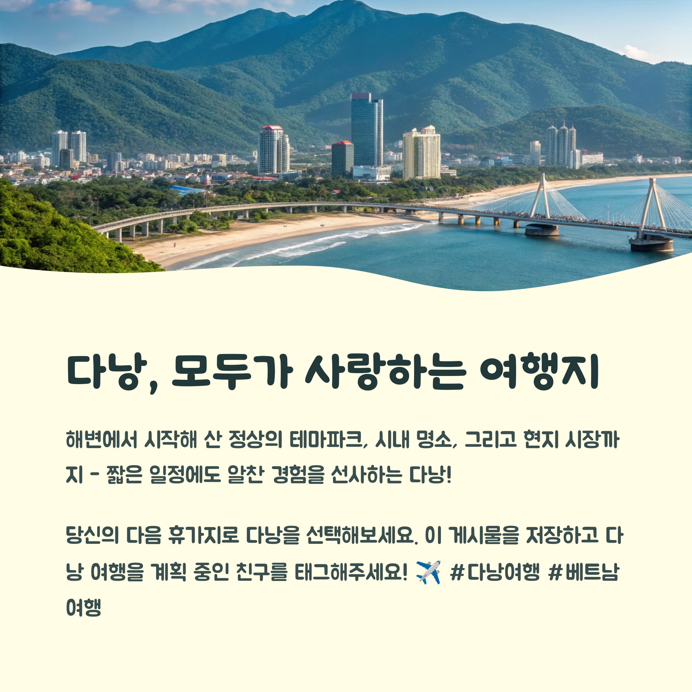 다낭은 짧은 일정 안에 감성, 자연, 맛, 힐링, 액티비티까지 모두 담아낼 수 있는 도시입니다. 미케비치의 노을, 바나힐의 이국적인 공기, 밤마다 빛나는 용다리 불쇼, 그리고 따뜻한 마사지와 현지인의 미소까지. 이 루트가 여러분의 다낭 여행을 계획이 아닌 추억으로 바꾸는 데 도움이 되었길 바라요. 가볍게 떠나도, 깊게 남는 도시 바로 다낭입니다 :)