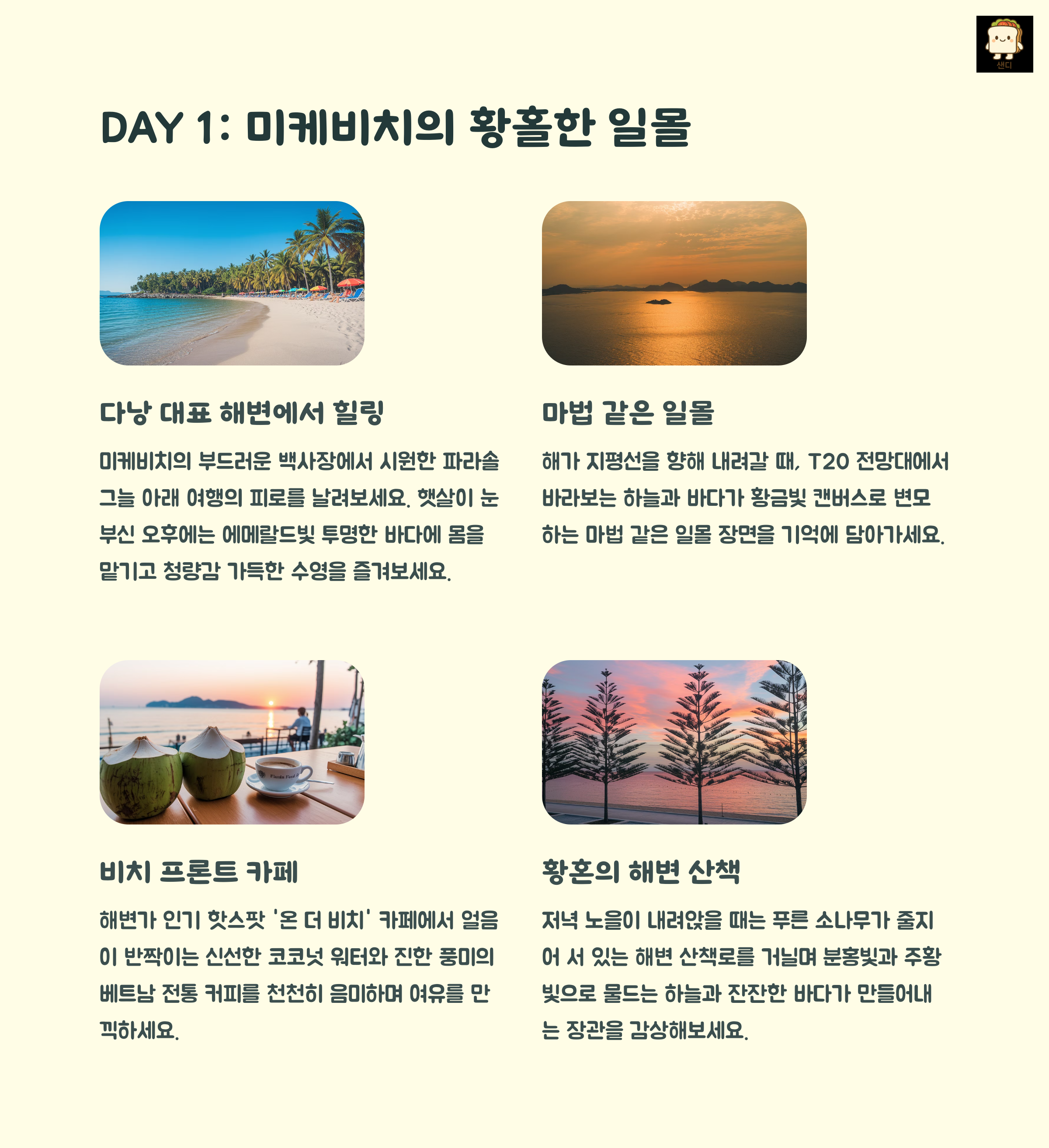 • 미케비치 일몰 감상 + 라운지 체험 • 저녁: 한강변 씨푸드 레스토랑 or 로컬 분짜 포인트: 첫날은 시차 적응과 바다 감성에 집중! 숙소는 미케비치 인근이면 어디든 OK.
