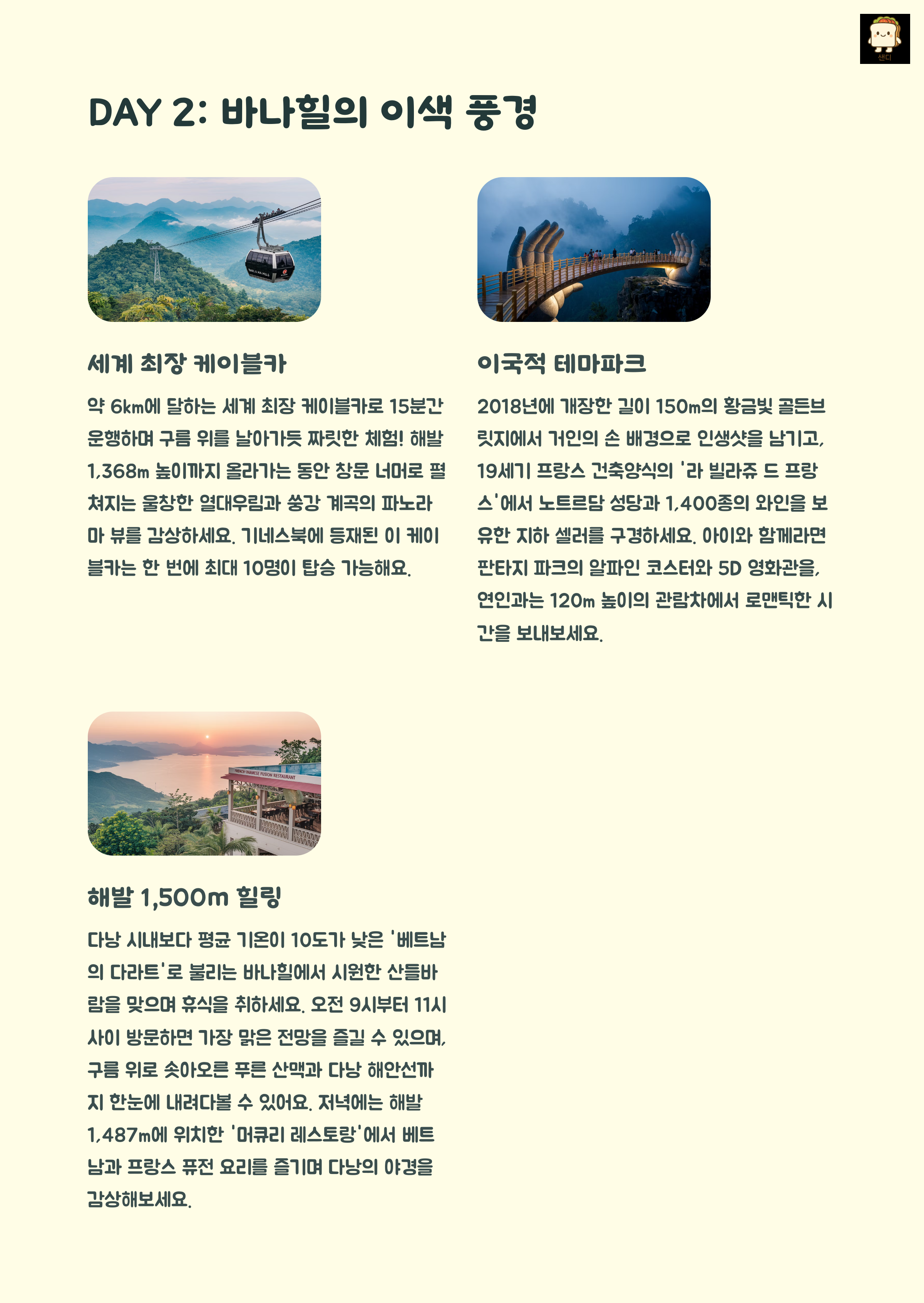 | 2 | 바나힐, 골든브릿지 | 고산 테마파크 |