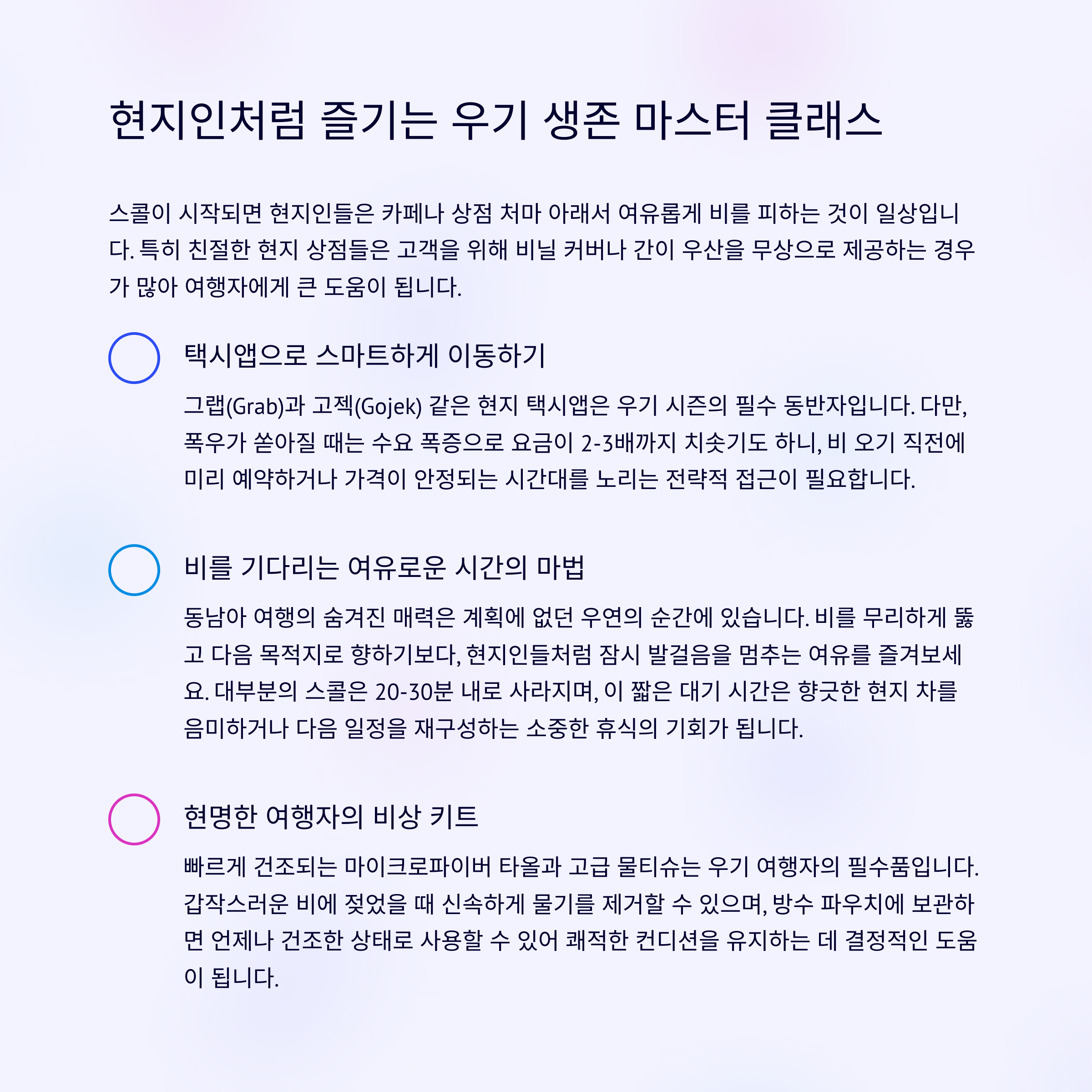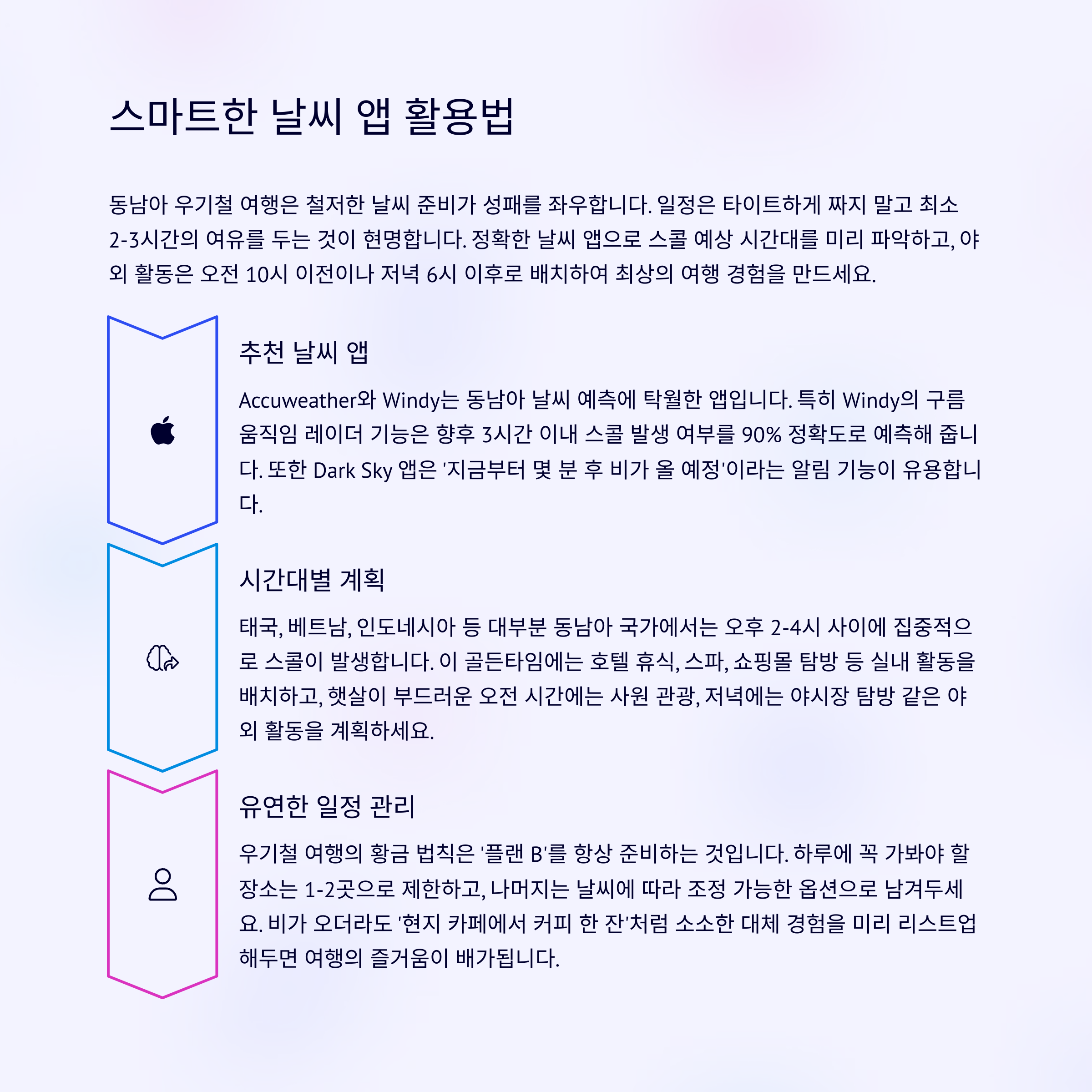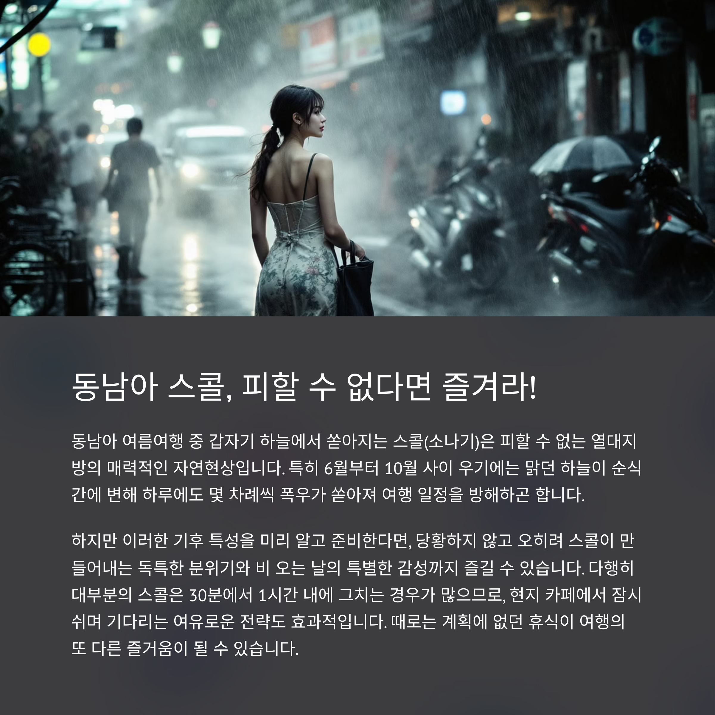 동남아 여름여행 중 갑자기 쏟아지는 비는 피할 수 없는 자연의 일부입니다. 특히 6월부터 10월 사이 우기에는 하루에도 몇 차례 스콜이 내리며 일정을 방해하곤 합니다. 하지만 미리 알고 준비하면 당황하지 않고 오히려 비 오는 날의 감성까지 즐길 수 있습니다. 이번 글에서는 동남아에서 여름철 비가 올 때 현지에서 유용한 대처법을 상황별로 안내드립니다.