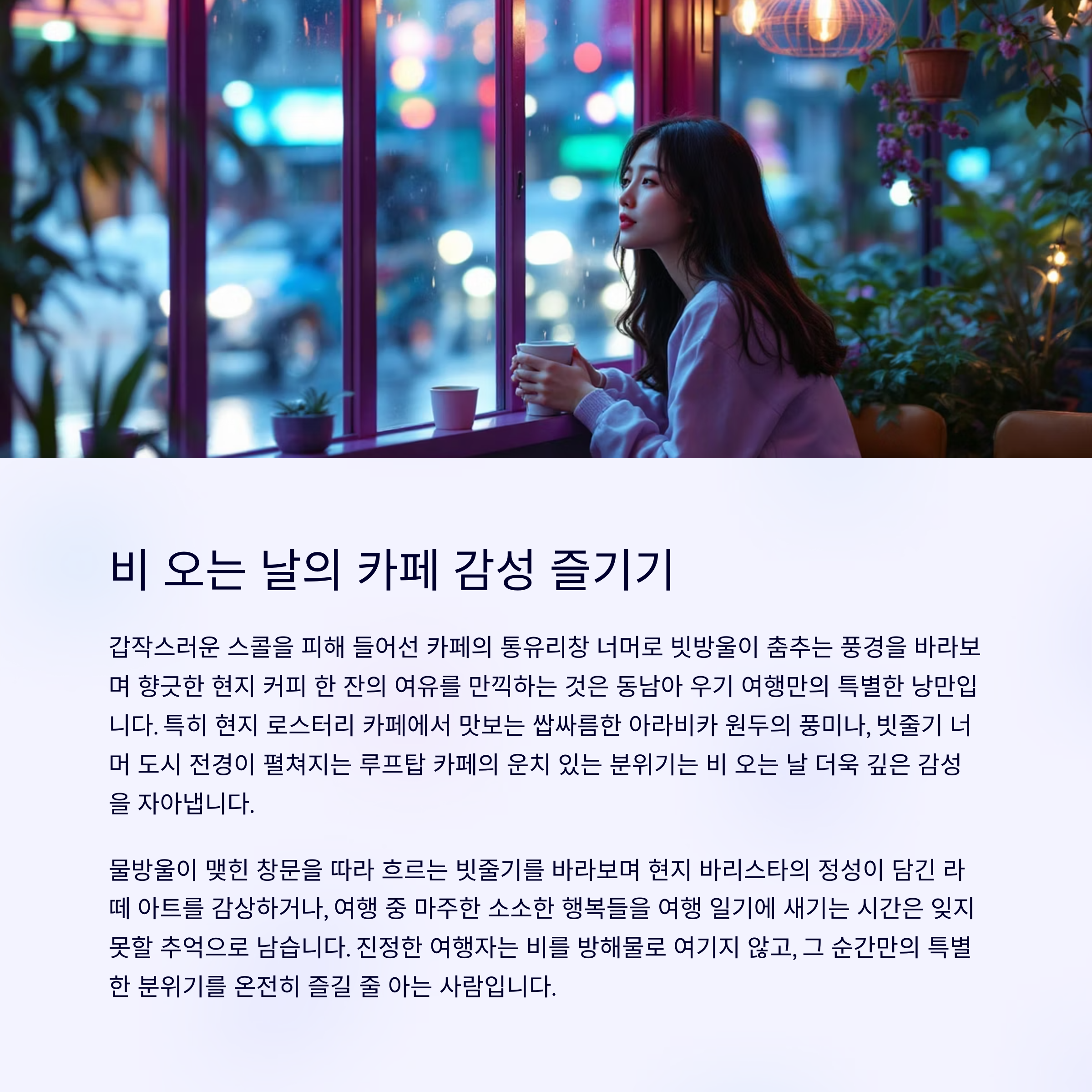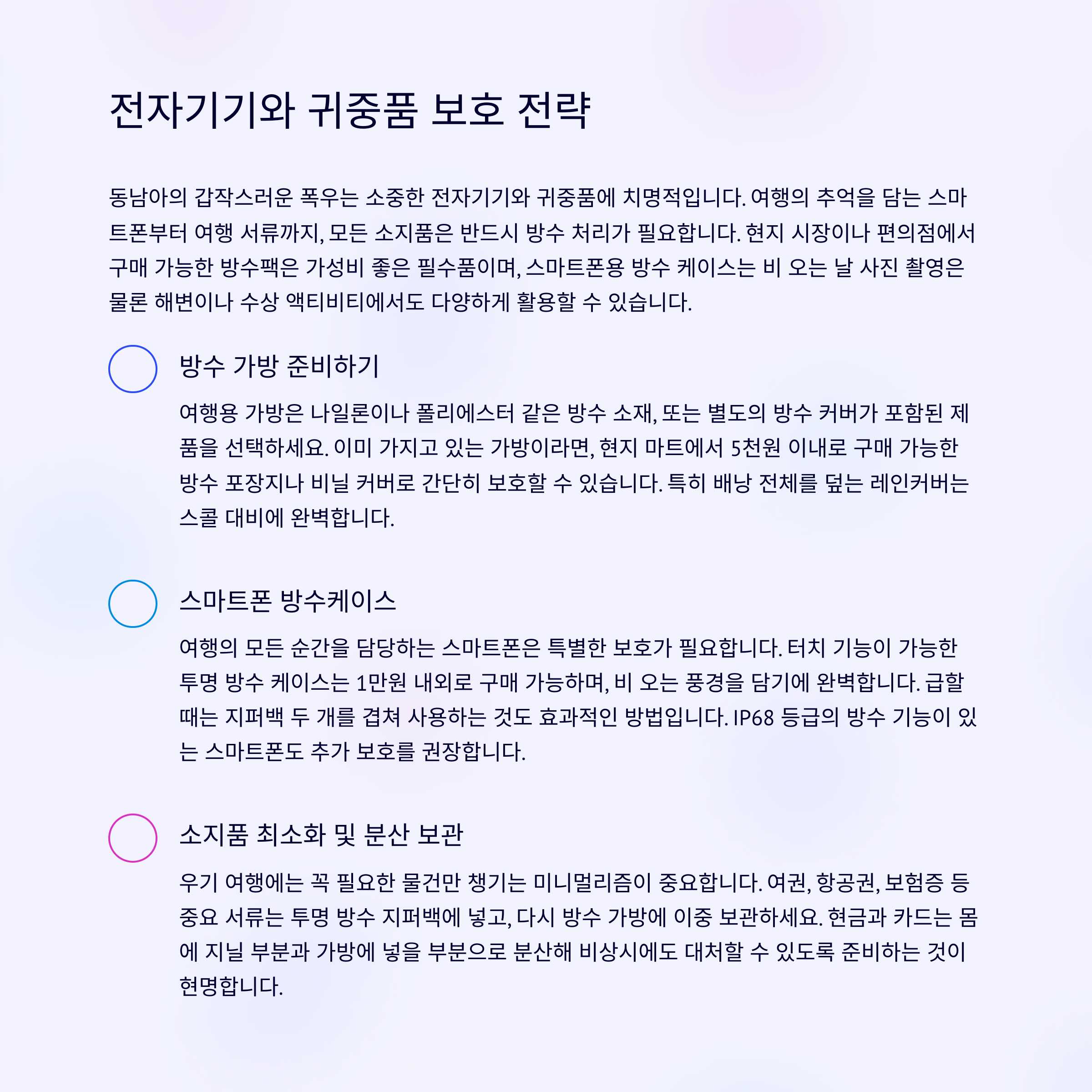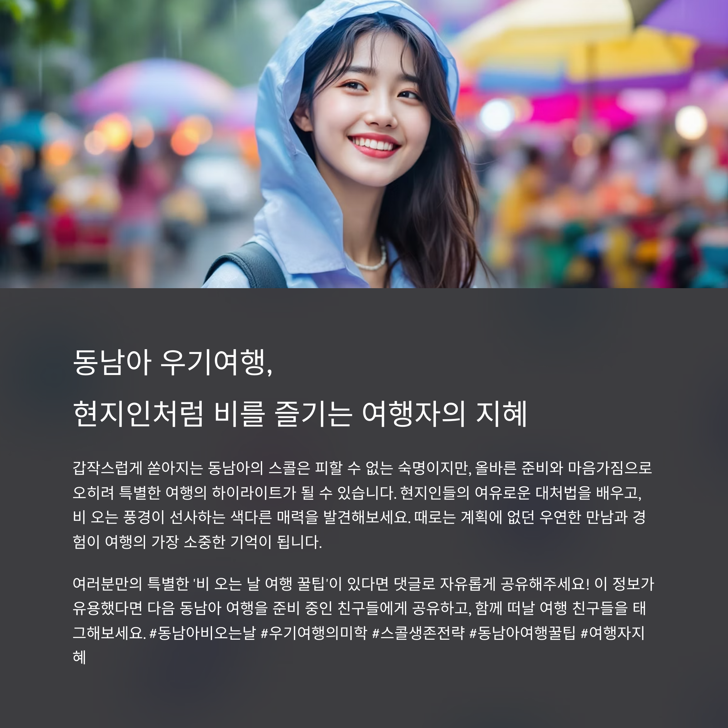 동남아 여름여행 중 갑자기 쏟아지는 비는 피할 수 없는 자연의 일부입니다. 특히 6월부터 10월 사이 우기에는 하루에도 몇 차례 스콜이 내리며 일정을 방해하곤 합니다. 하지만 미리 알고 준비하면 당황하지 않고 오히려 비 오는 날의 감성까지 즐길 수 있습니다. 이번 글에서는 동남아에서 여름철 비가 올 때 현지에서 유용한 대처법을 상황별로 안내드립니다.