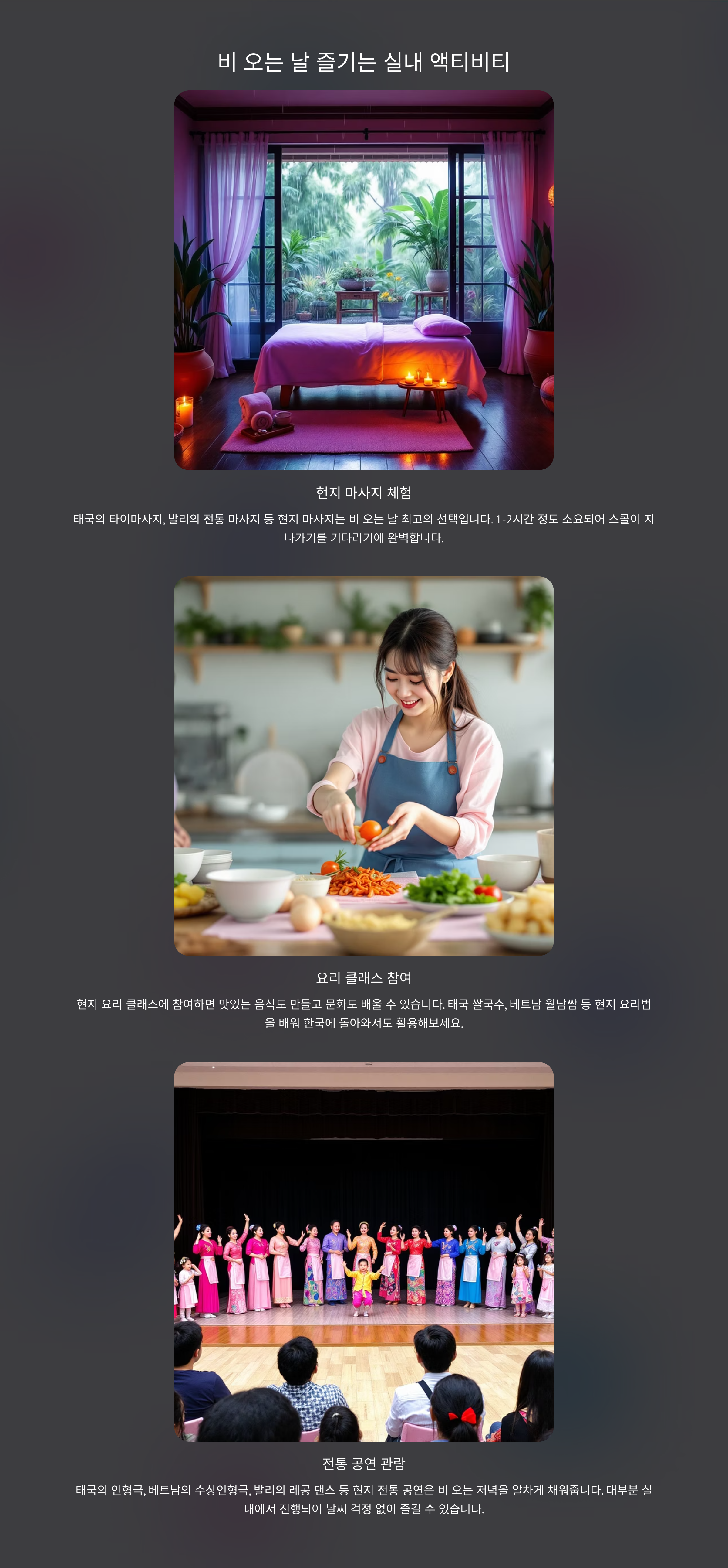 | 공연 관람 | 전통 인형극, 무용극 | 비 오는 밤 추천 |