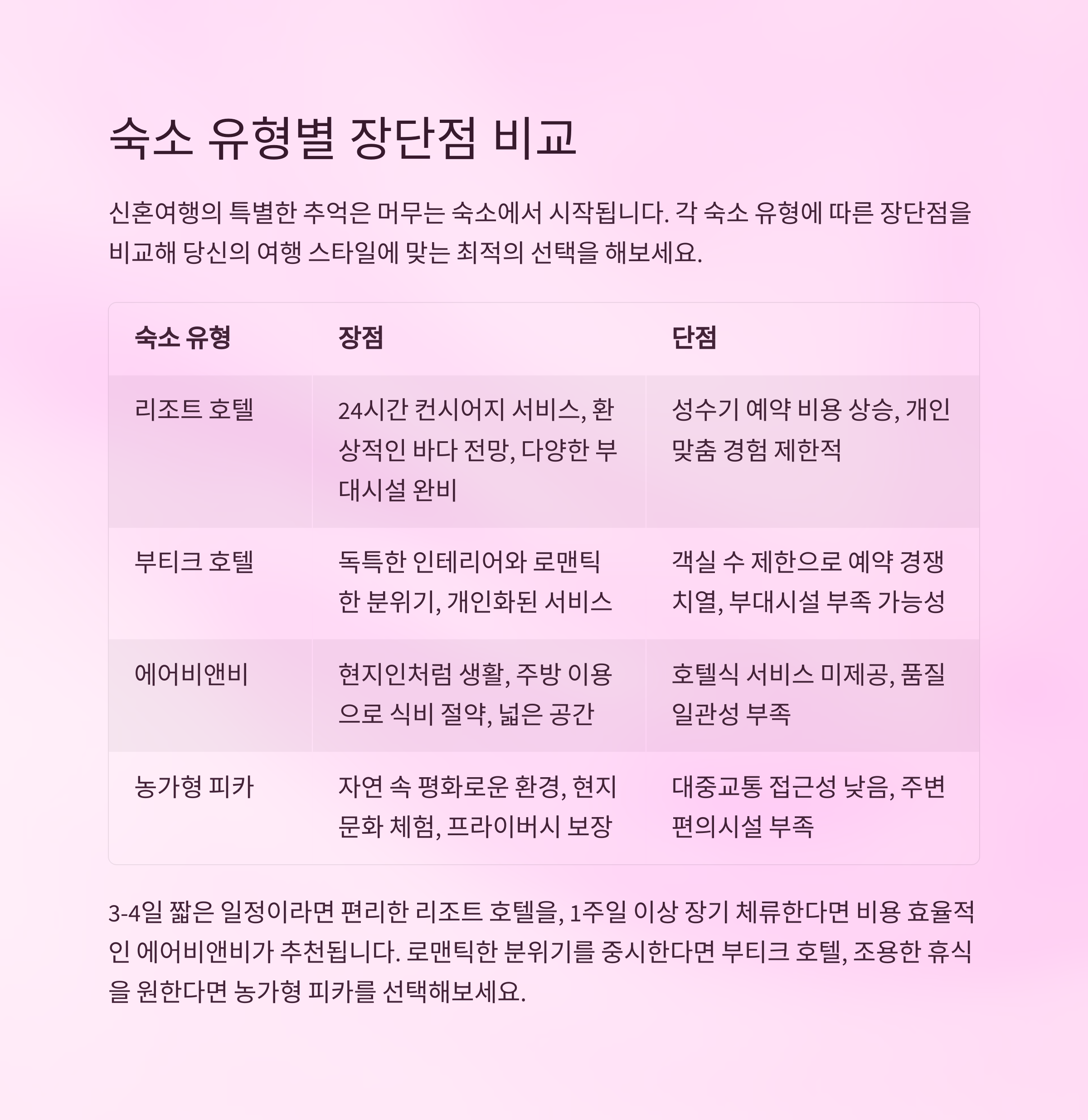 | 부티크 호텔 | 분위기 있고 감성적 | 규모 작아 예약 경쟁 심함 |