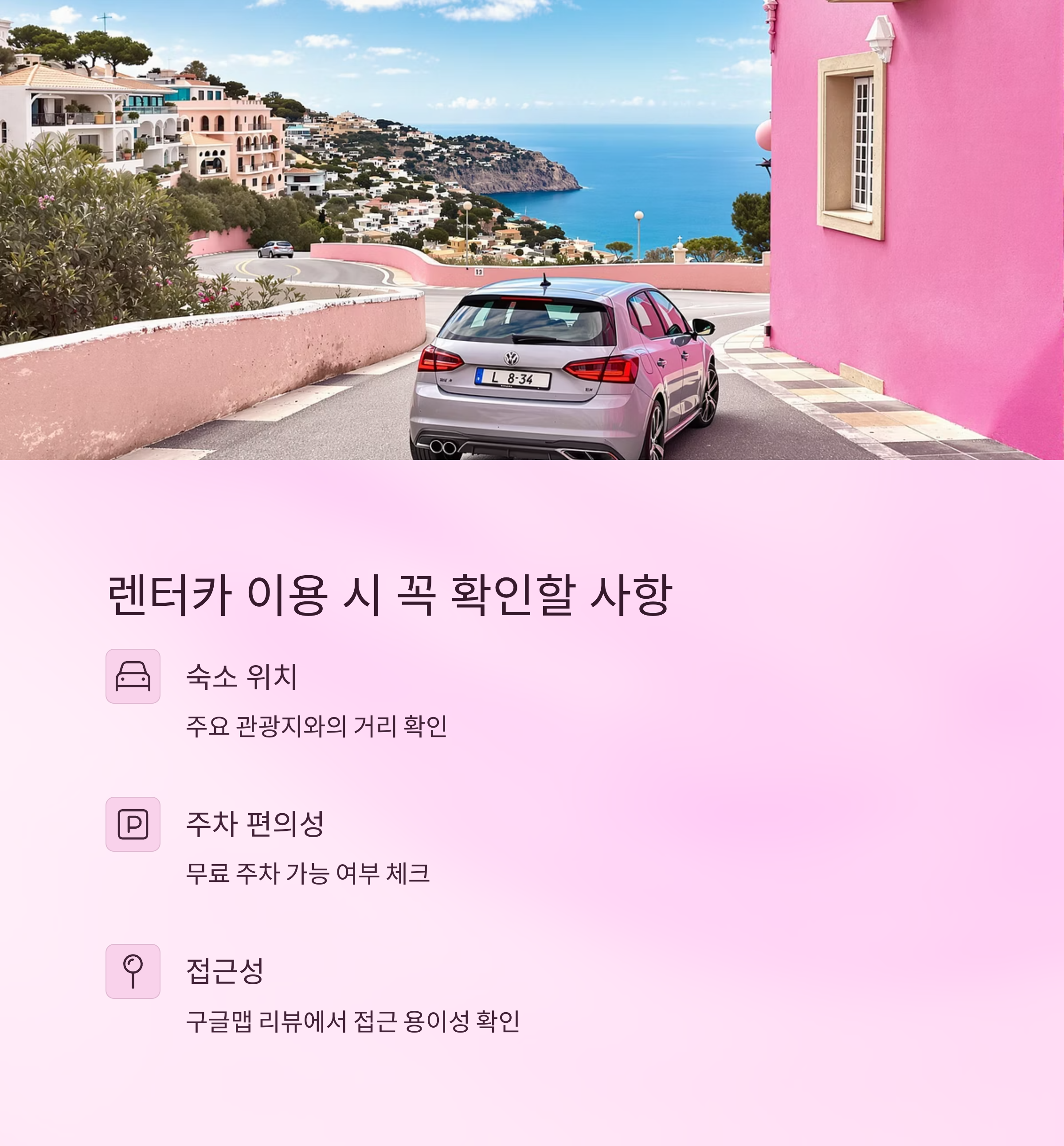 숙소 위치와 주차 편의성이 아주 중요해요.