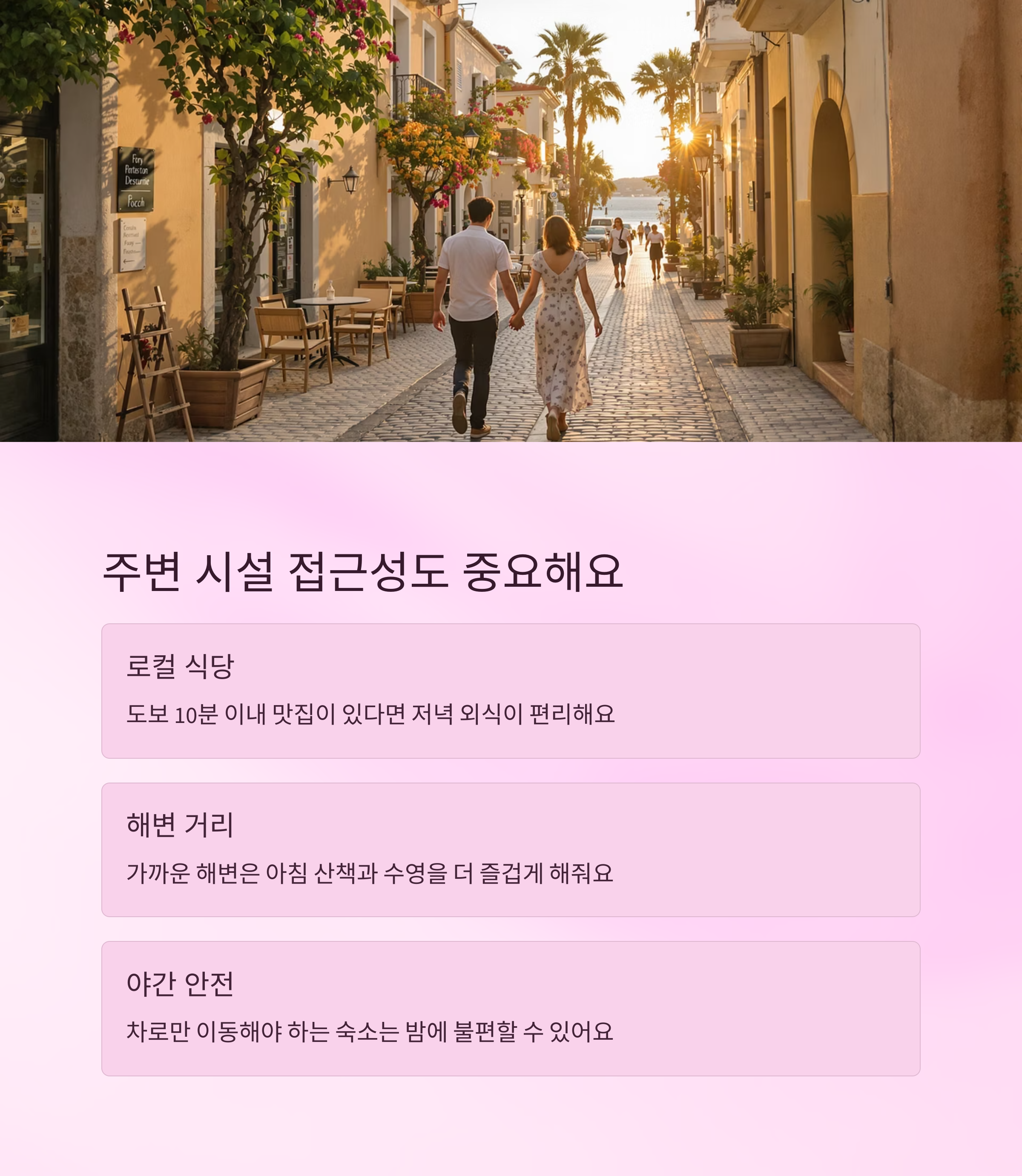 숙소 주변 환경이 전체 여행 분위기를 결정짓기 때문에 꼭 미리 확인해보세요.
