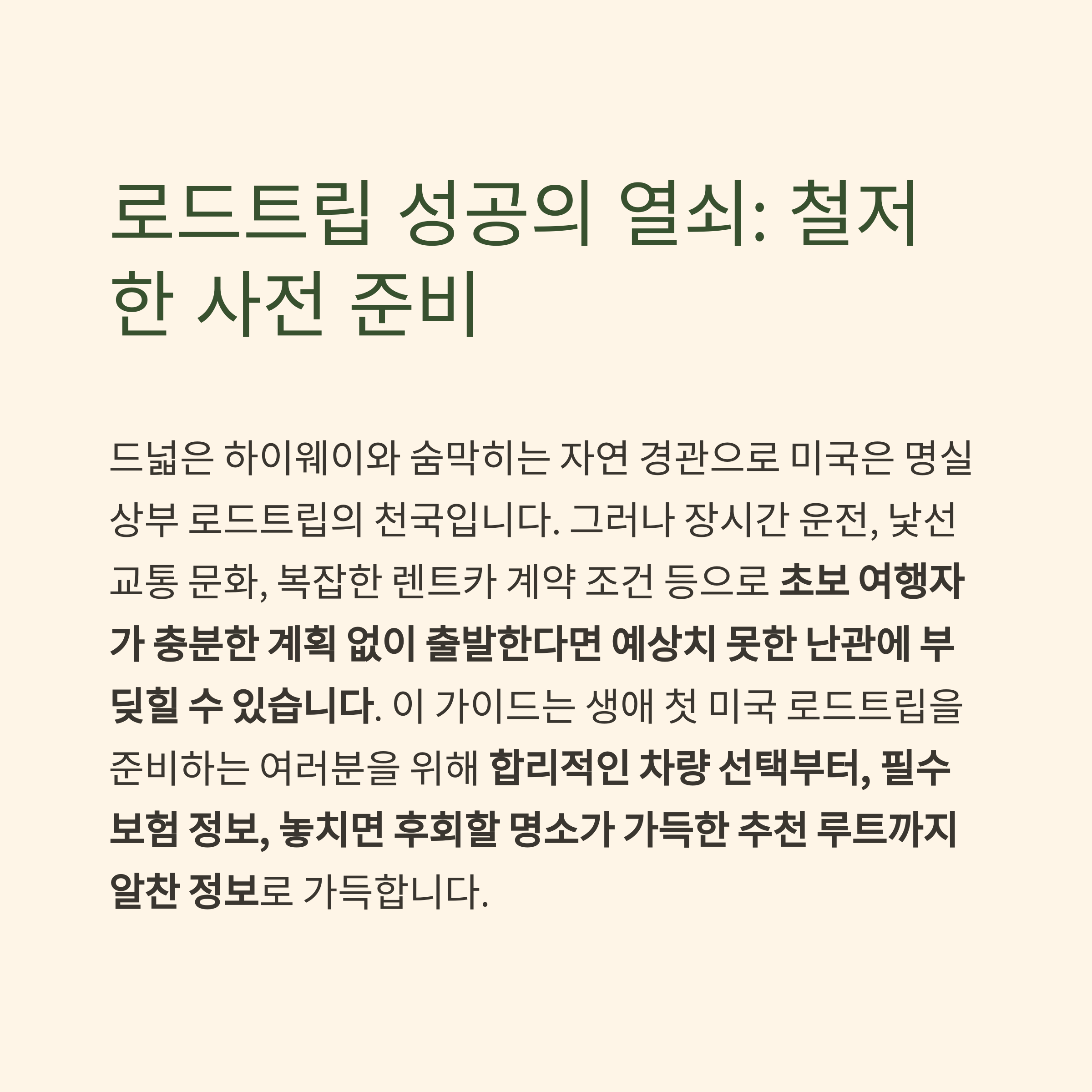 로드트립의 핵심은 계획 + 보험 + 유연성 안전하게, 자유롭게, 후회 없이 떠나세요!