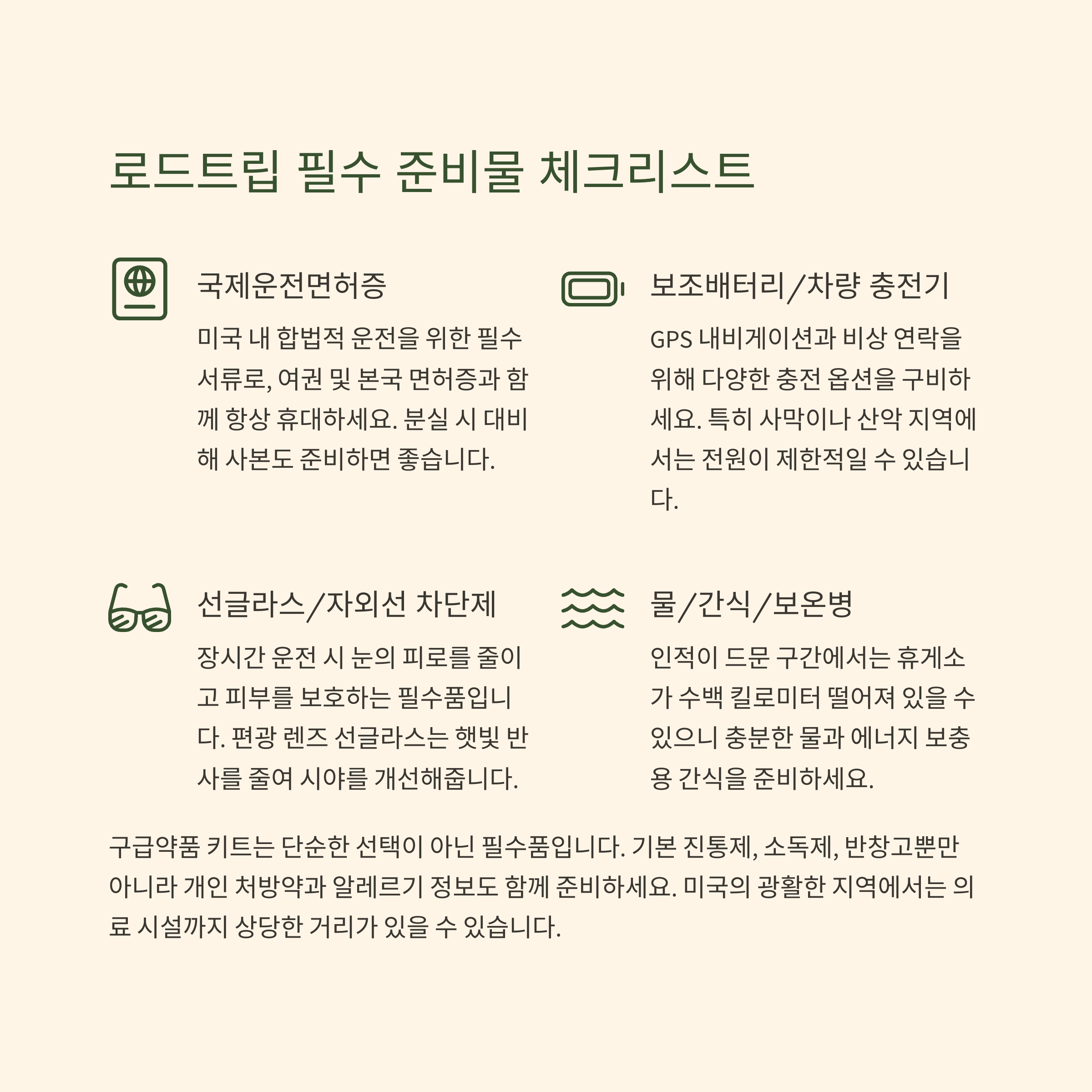 다음은 로드트립 시 반드시 챙겨야 할 준비물입니다