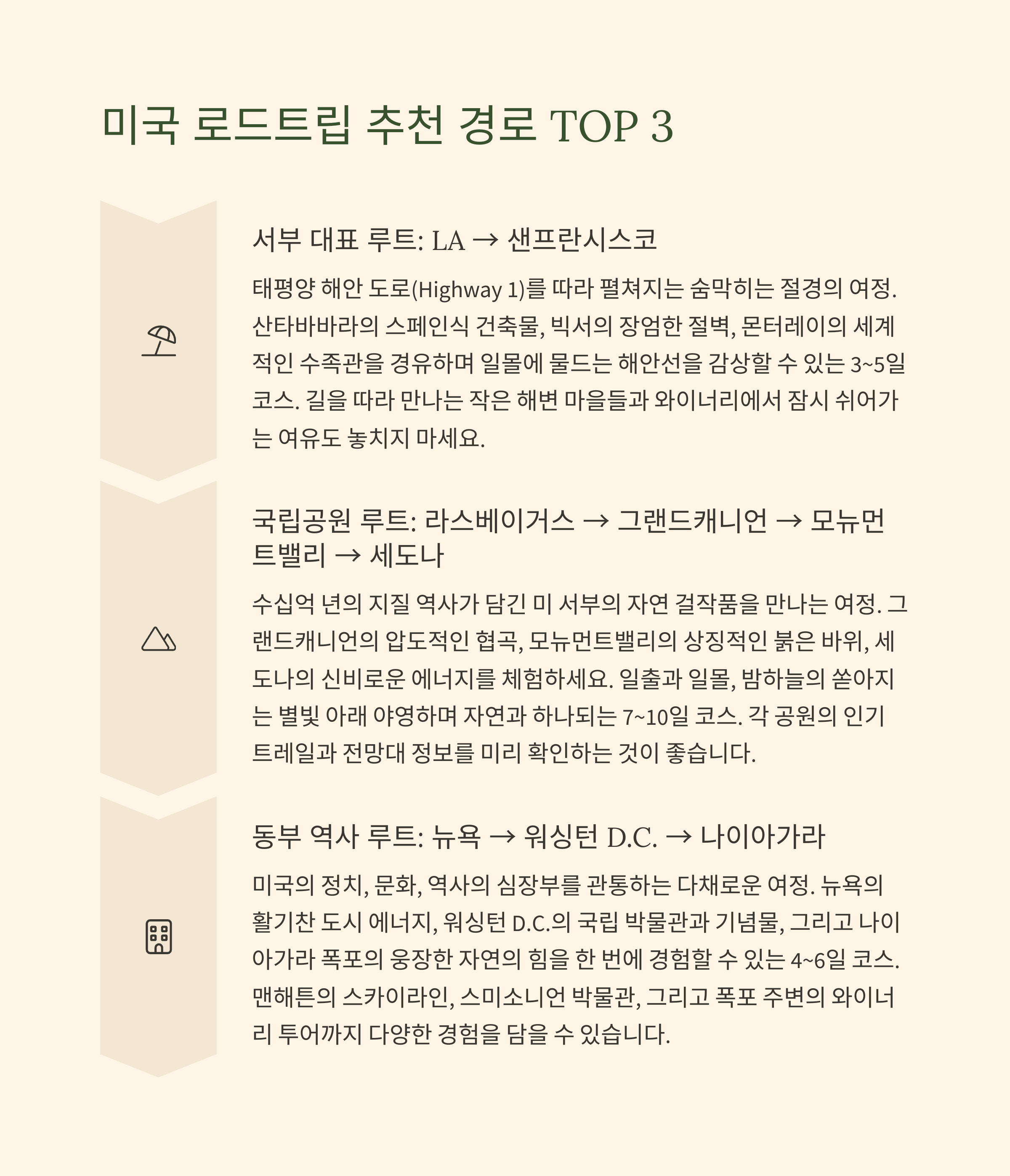 다음은 여행 스타일별로 추천하는 대표 로드트립 경로입니다