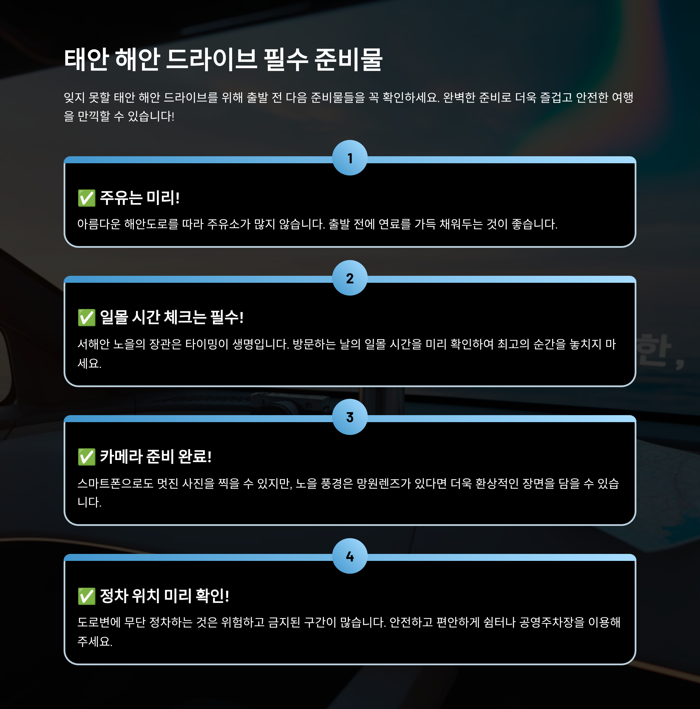 - 일몰 시간 체크: 특히 서해 노을 구간은 타이밍이 핵심