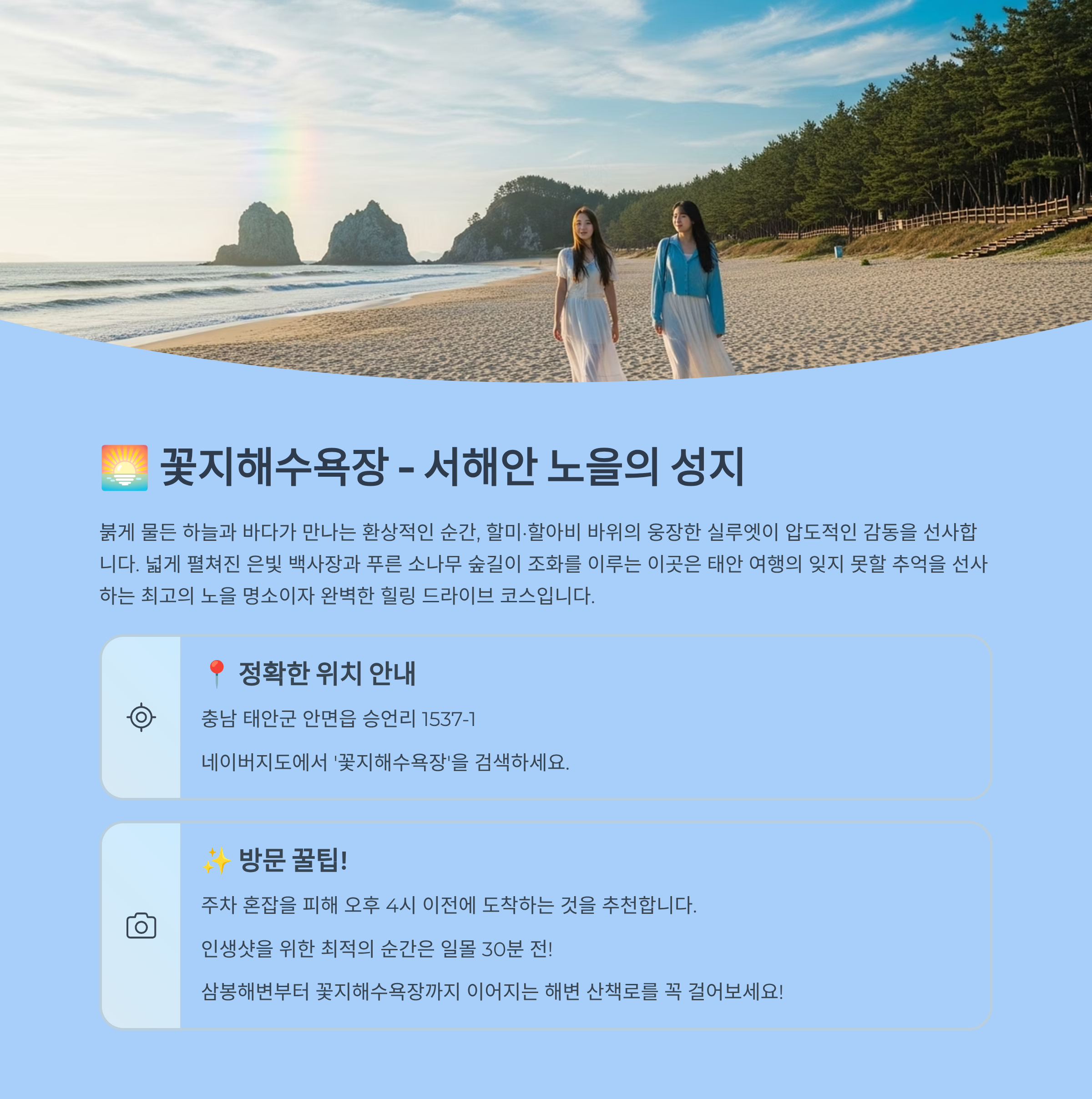 - 팁: 오후 4시 이전 도착 추천 (주차장 혼잡), 사진은 일몰 30분 전이 황금 타이밍