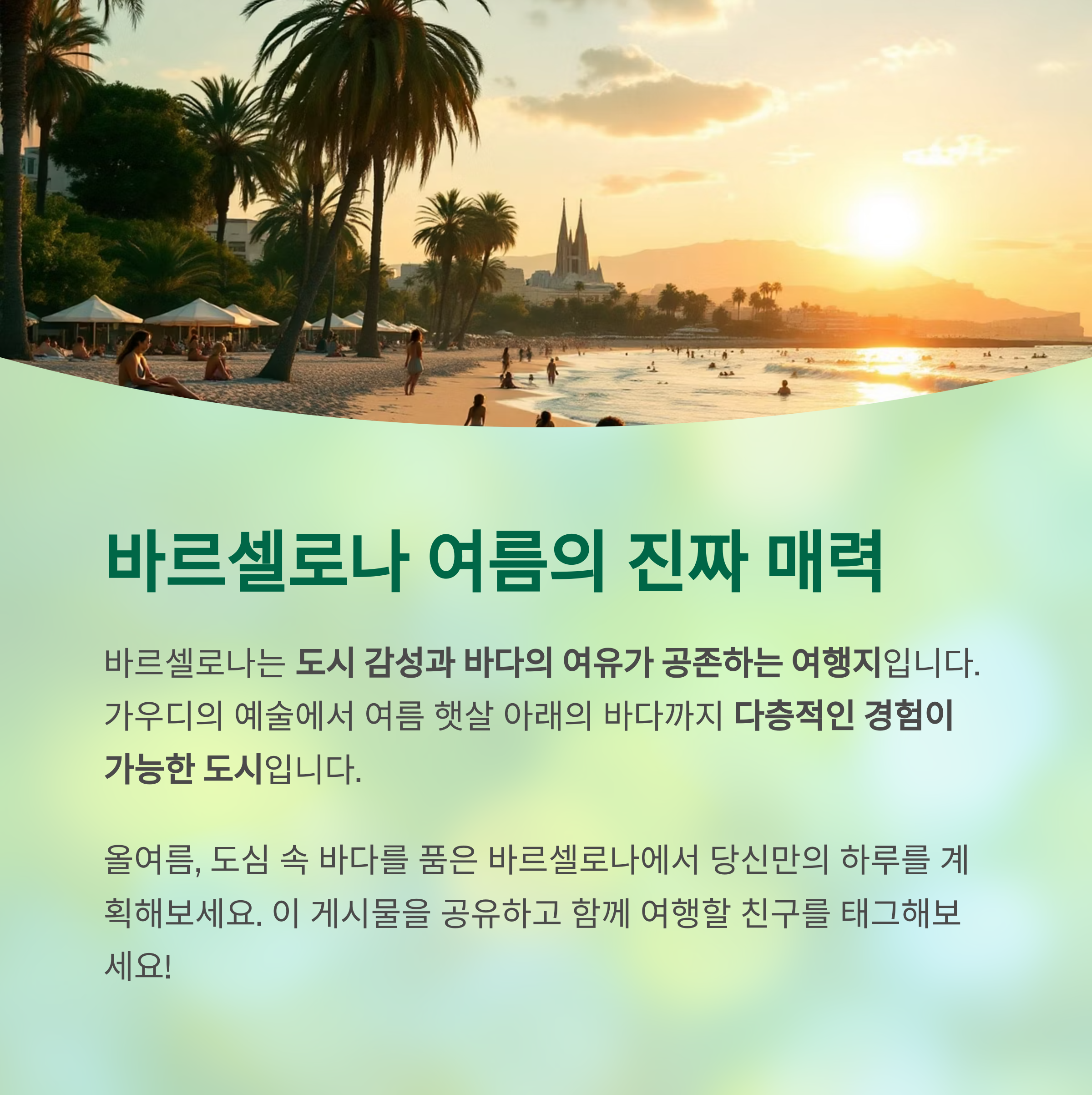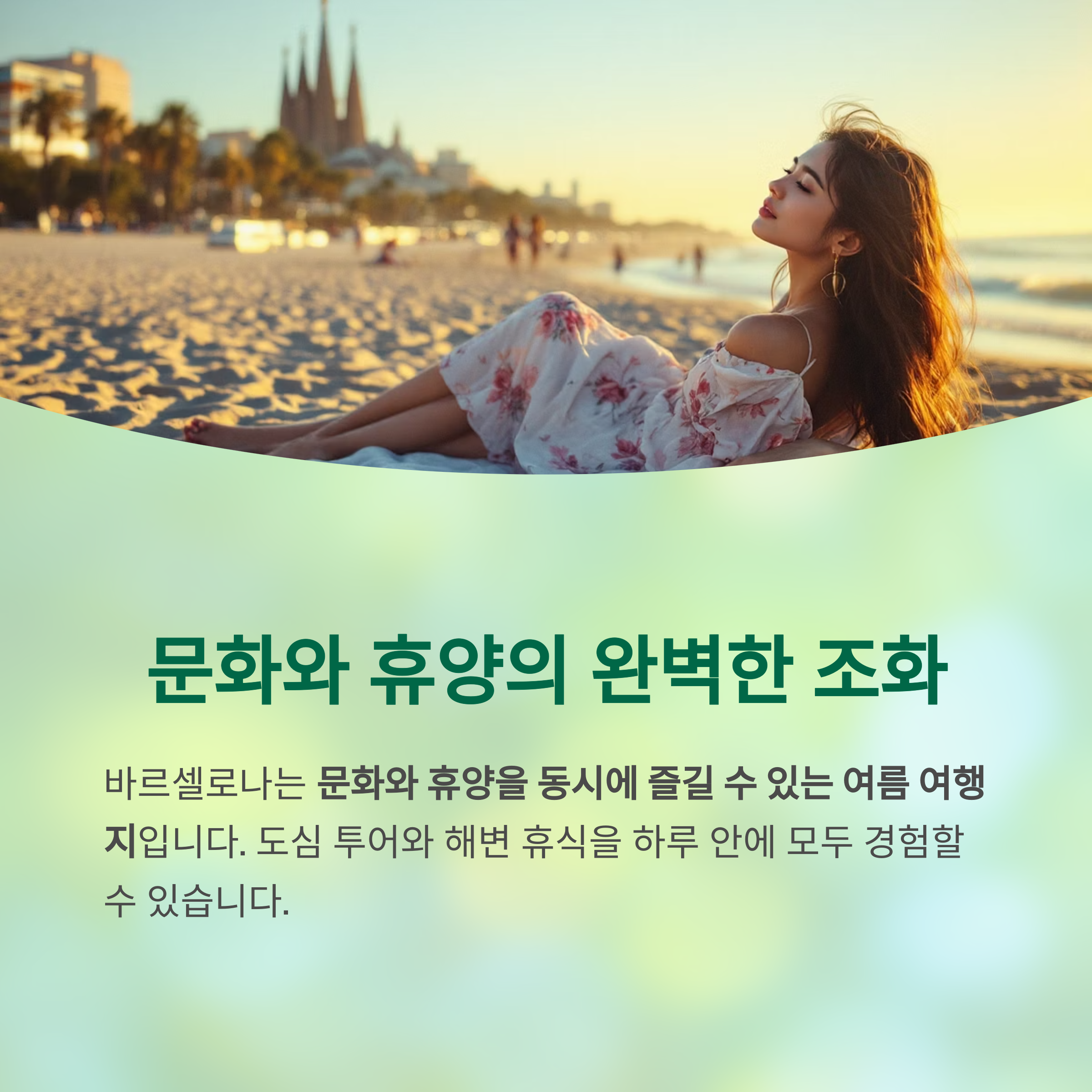 스페인의 대표적인 해변 도시 바르셀로나는 문화와 휴양을 동시에 즐길 수 있는 여름 여행지입니다.