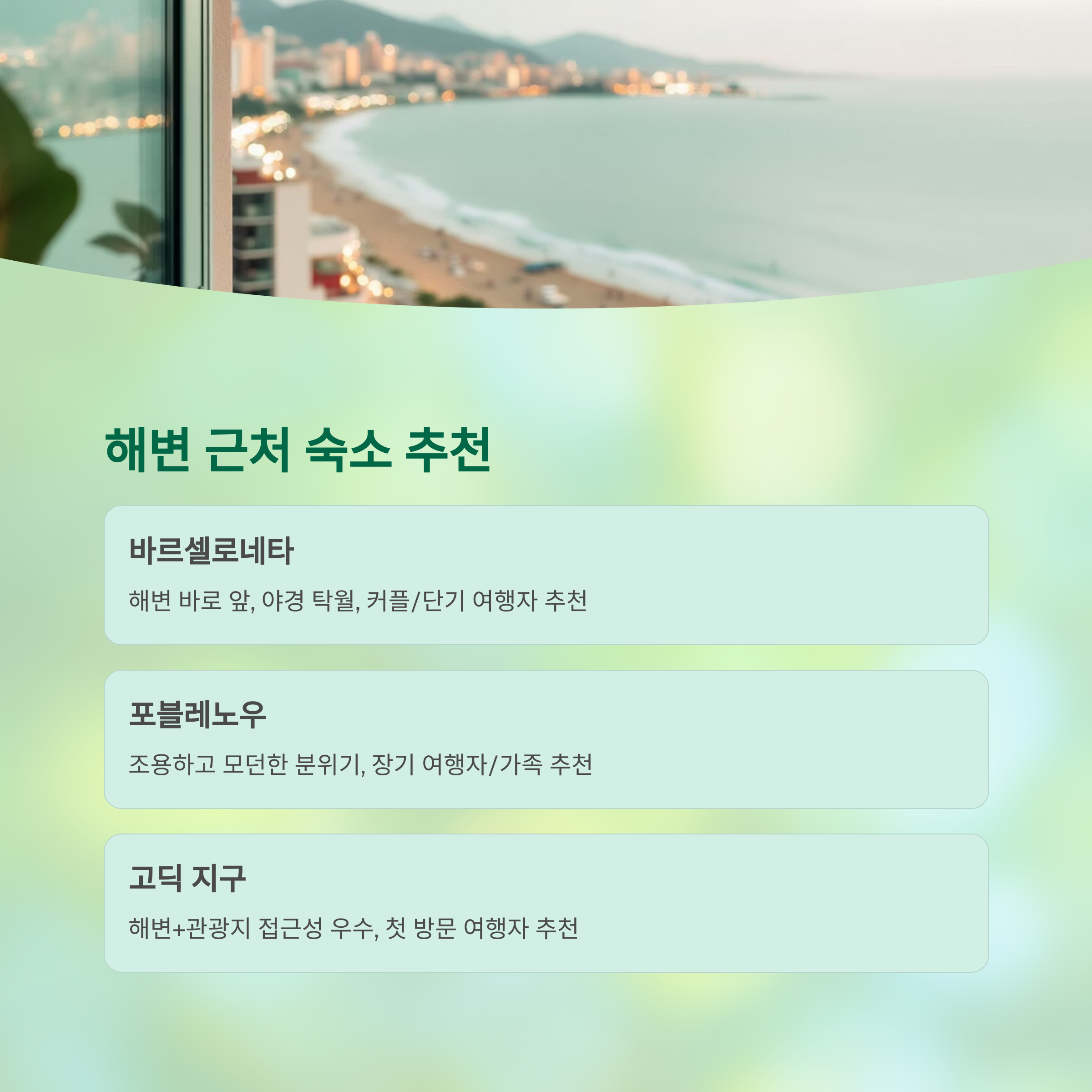 숙소는 해변과의 거리, 대중교통 접근성, 야경 여부를 기준으로 선택하면 만족도가 높습니다.