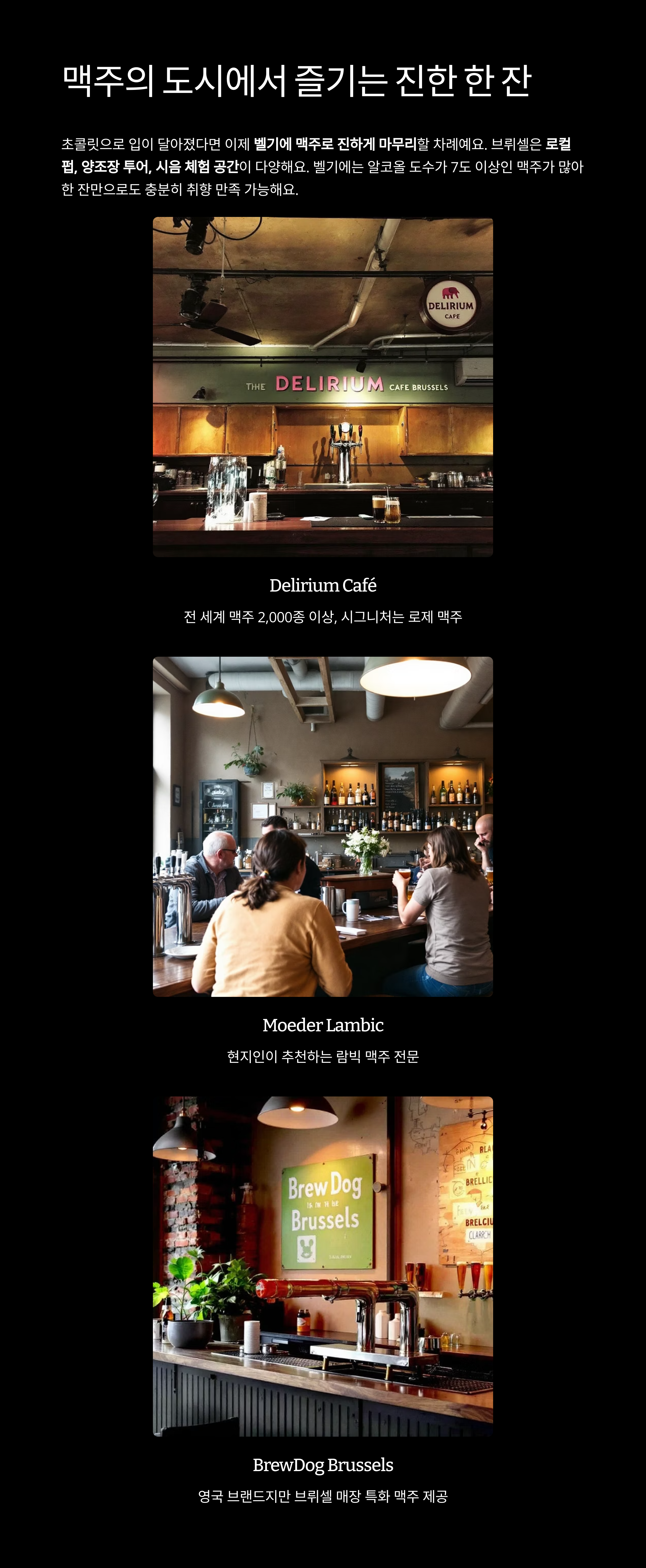 브뤼셀은 로컬 펍, 양조장 투어, 시음 체험 공간이 다양해요.
