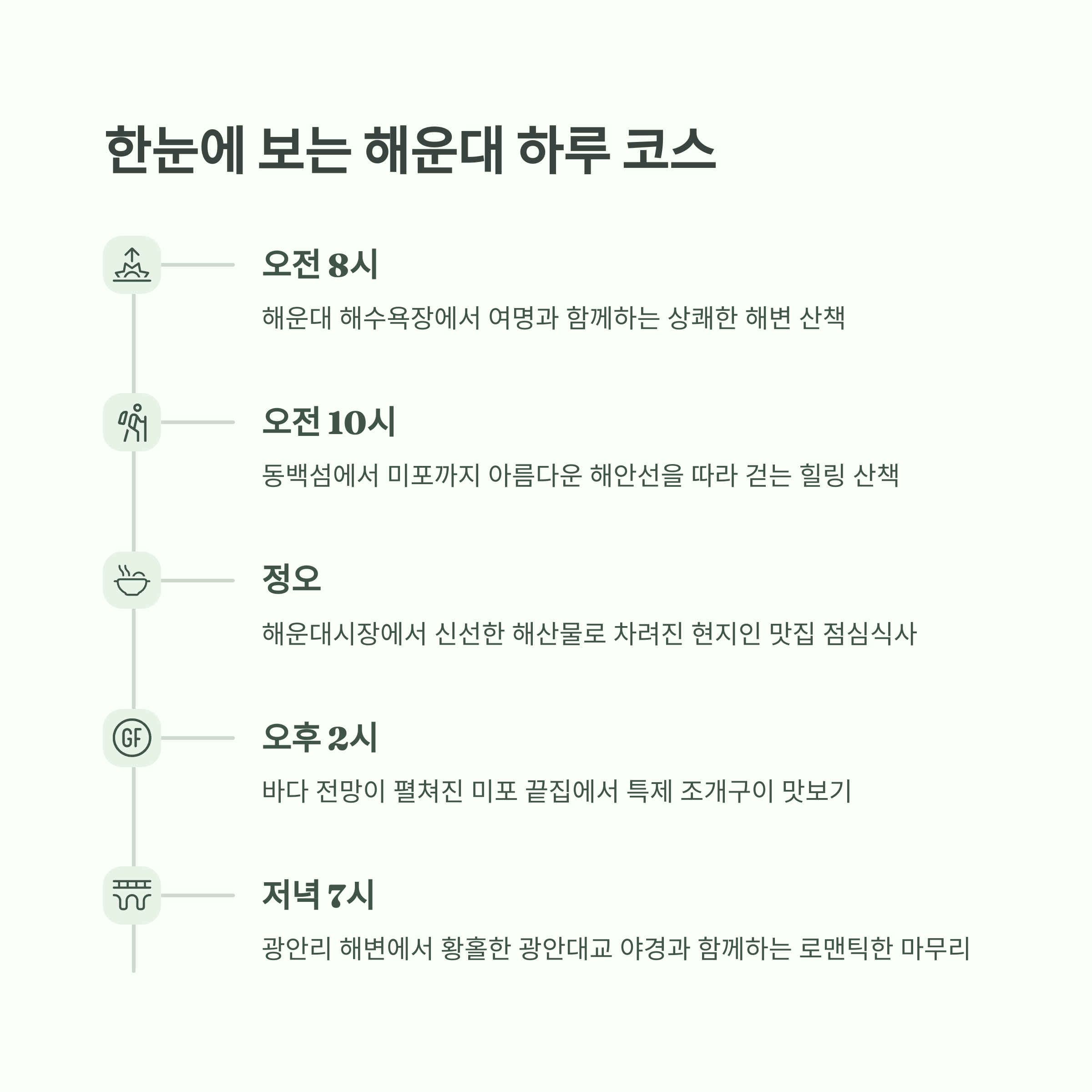 | 오전 8시 | 해변 산책 | 해운대 해수욕장 |