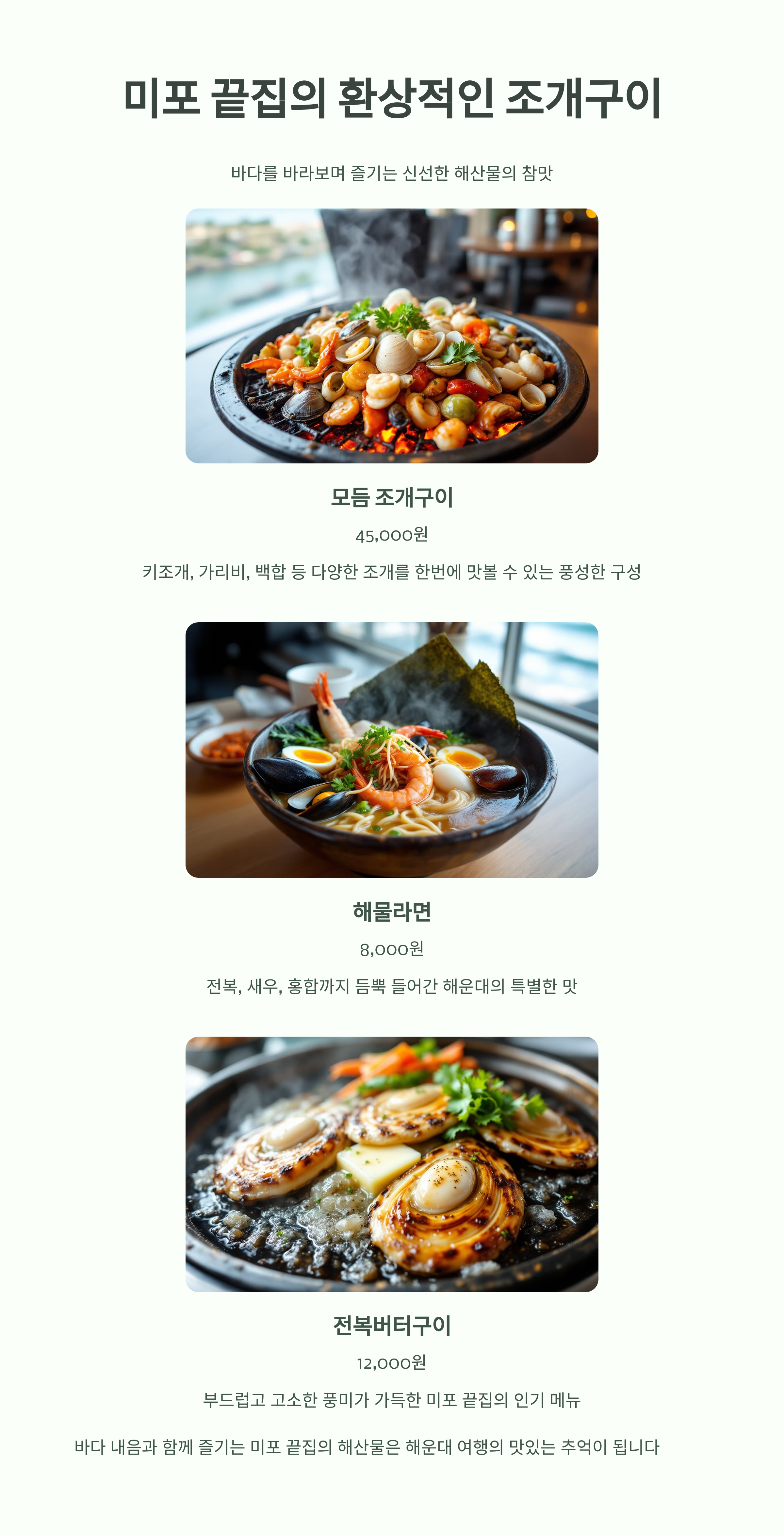 | 모듬 조개구이 | 45,000원 | 키조개, 가리비, 백합 등 다양 구성 |