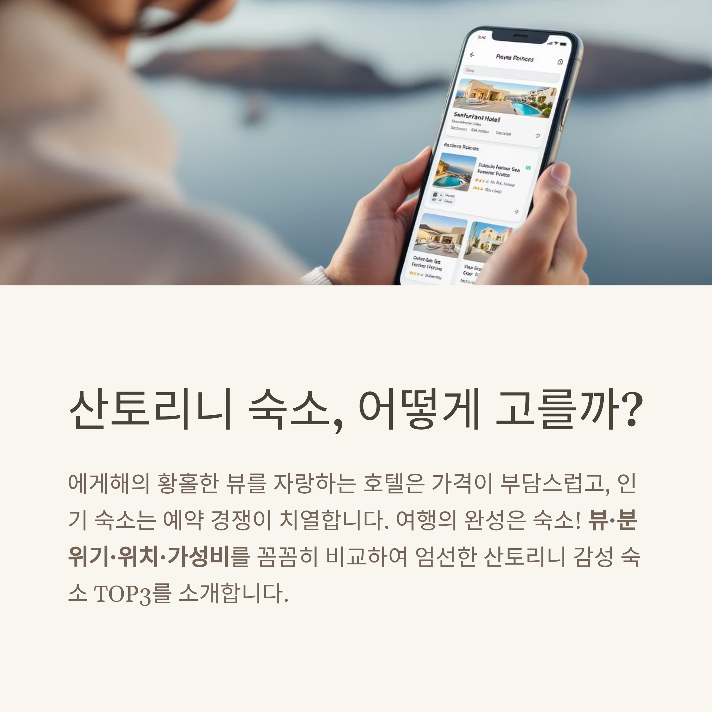 오늘은 뷰·분위기·위치·가성비를 기준으로 산토리니 감성 숙소 TOP3를 소개합니다.