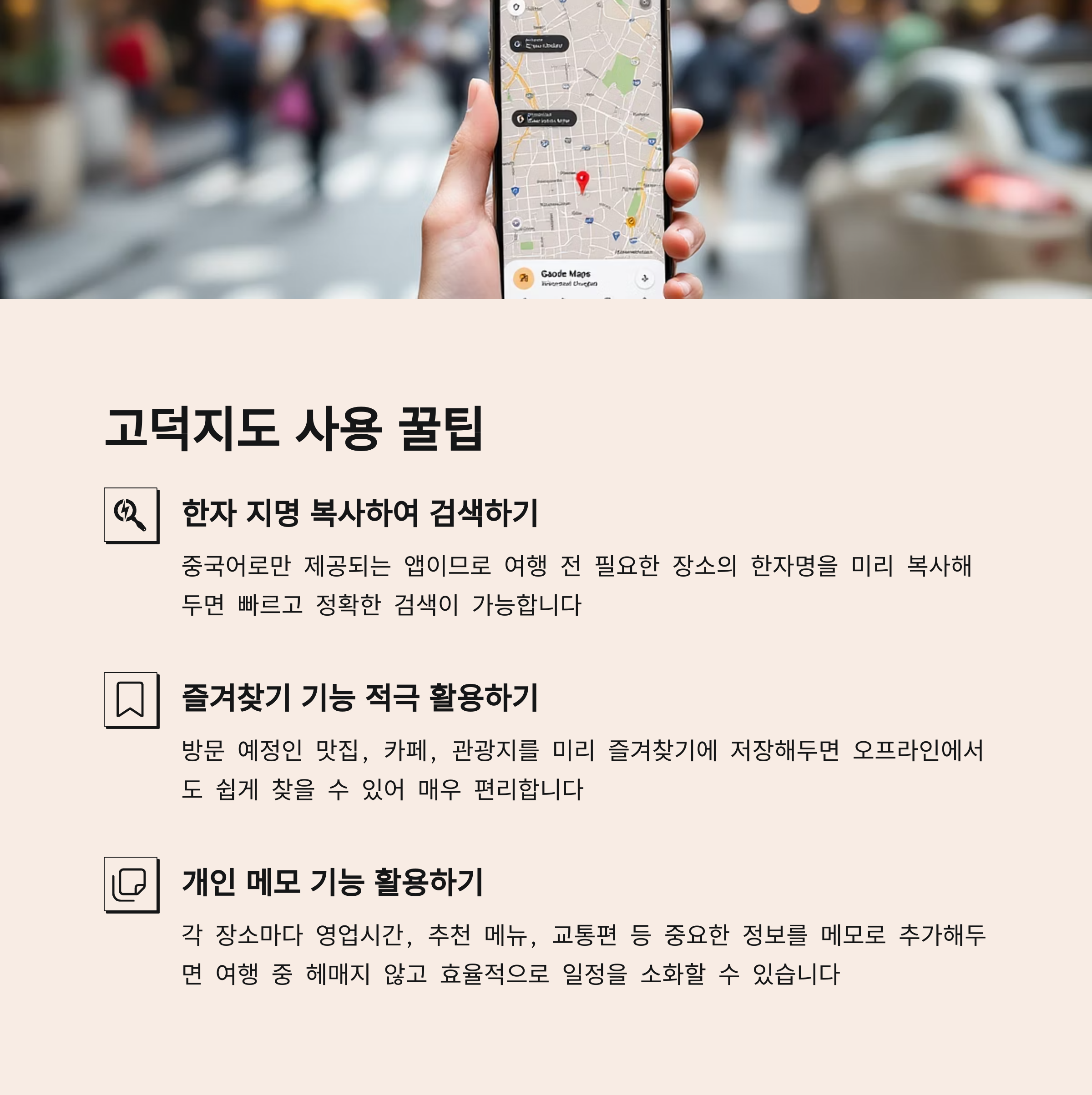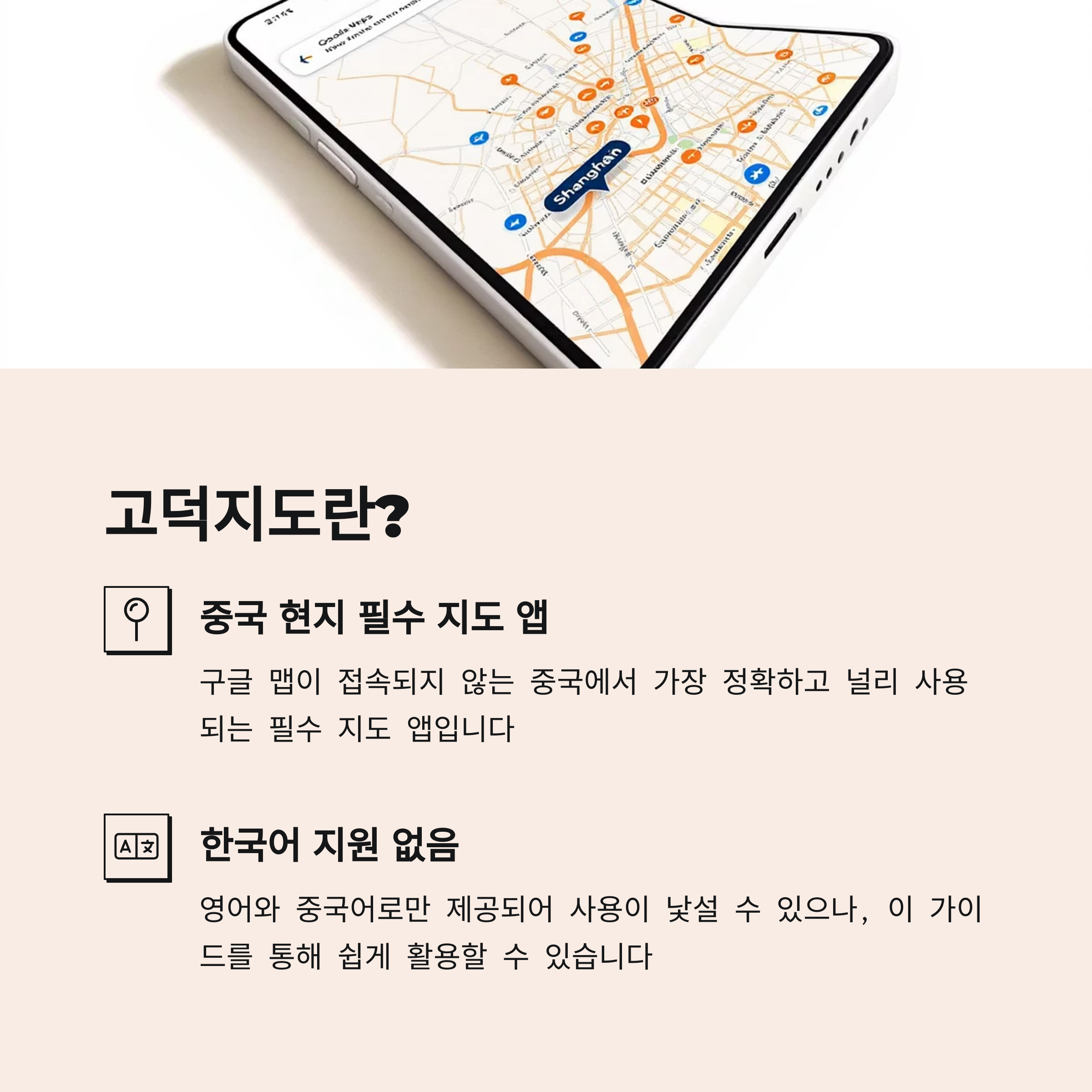고덕지도(高德地图)는 중국 현지에서 가장 널리 사용되는 지도 앱으로, 구글 맵이 제한적인 중국에서 필수입니다. 하지만 한국어 지원이 없어 사용이 어려울 수 있습니다. 이에 따라 상하이 여행자들을 위해 맛집과 카페 정보를 정리한 고덕지도 가이드가 유용합니다.