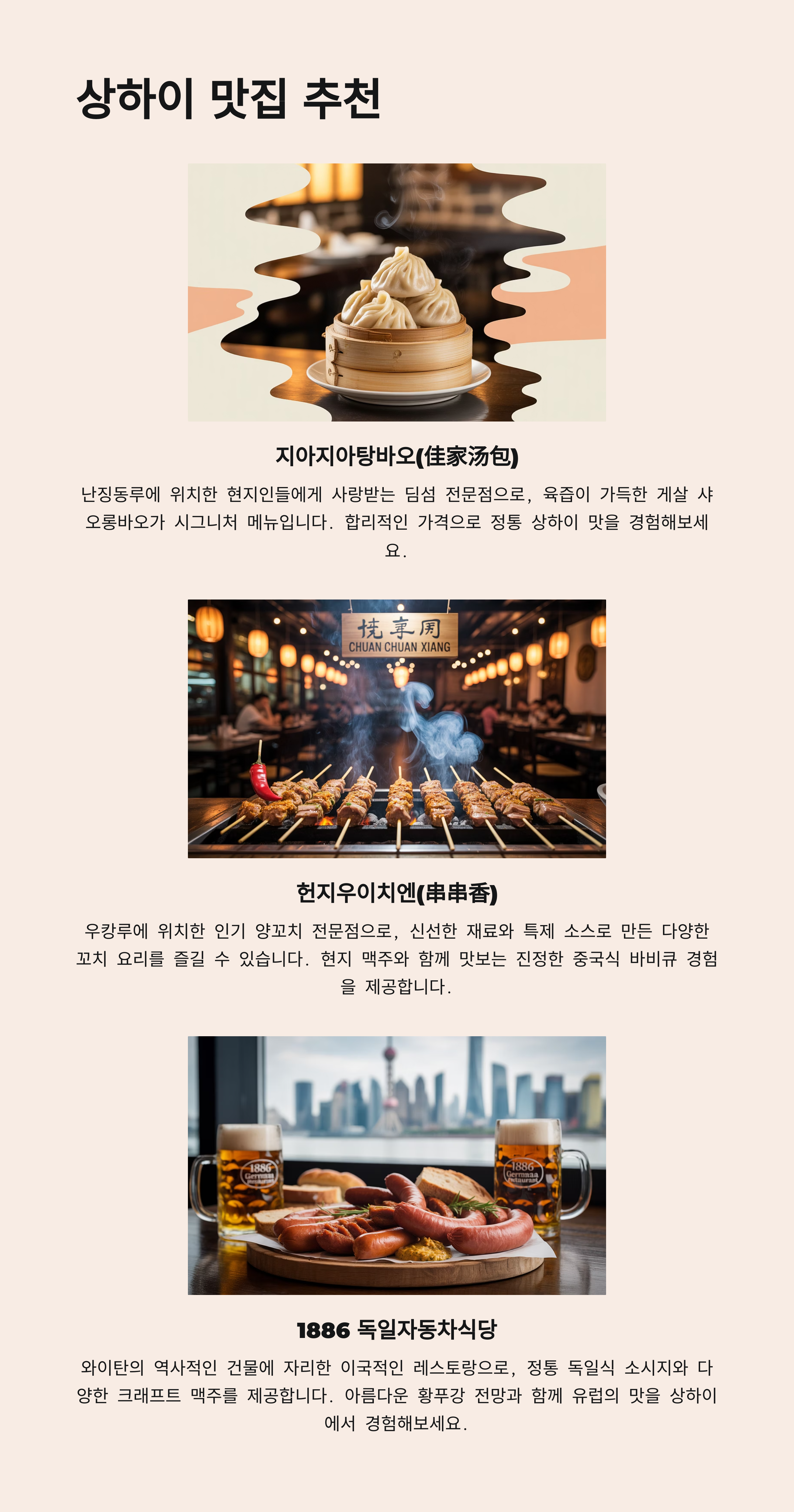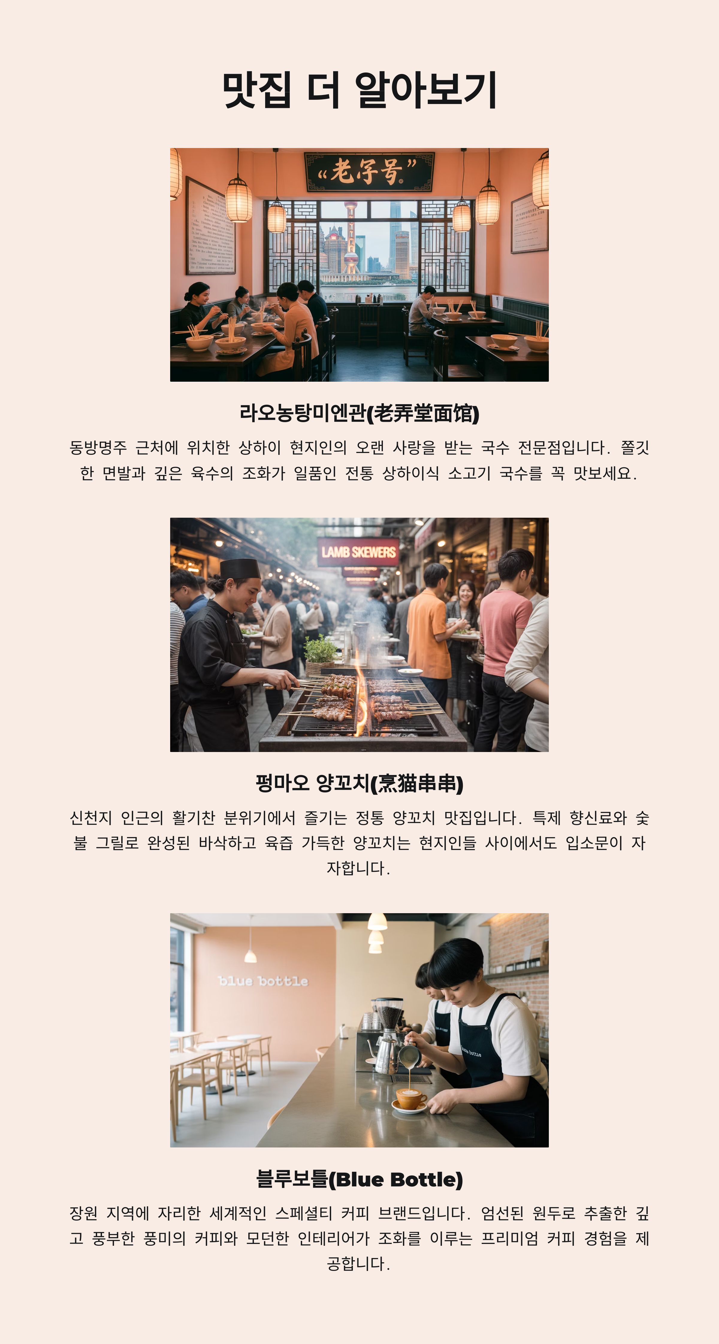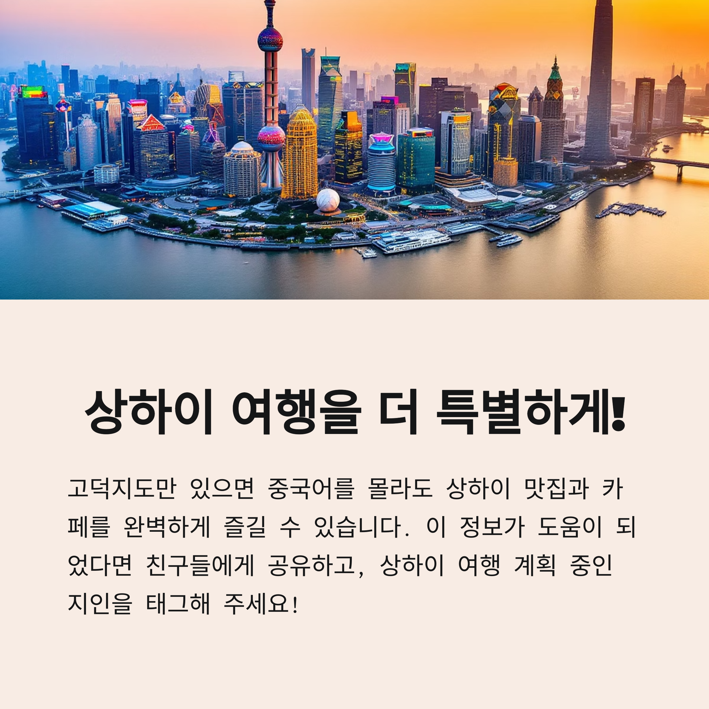상하이 여행을 계획 중이라면, 고덕지도를 활용한 맛집과 카페 정보를 미리 확인하고 즐겨찾기에 추가해두세요. 이를 통해 현지에서의 이동과 탐색이 훨씬 수월해질 것입니다.