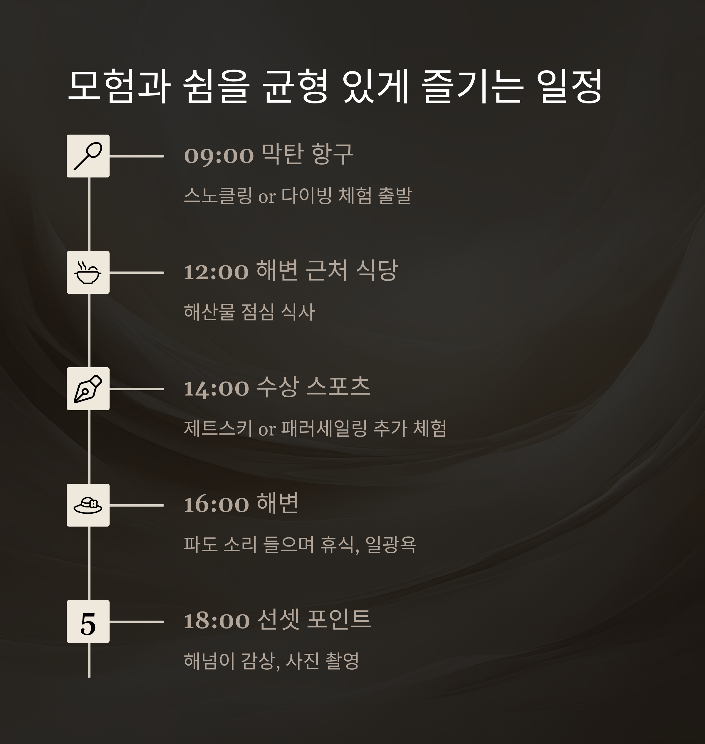 | 16:00 | 해변으로 이동 | 파도 소리 들으며 휴식, 일광욕 |