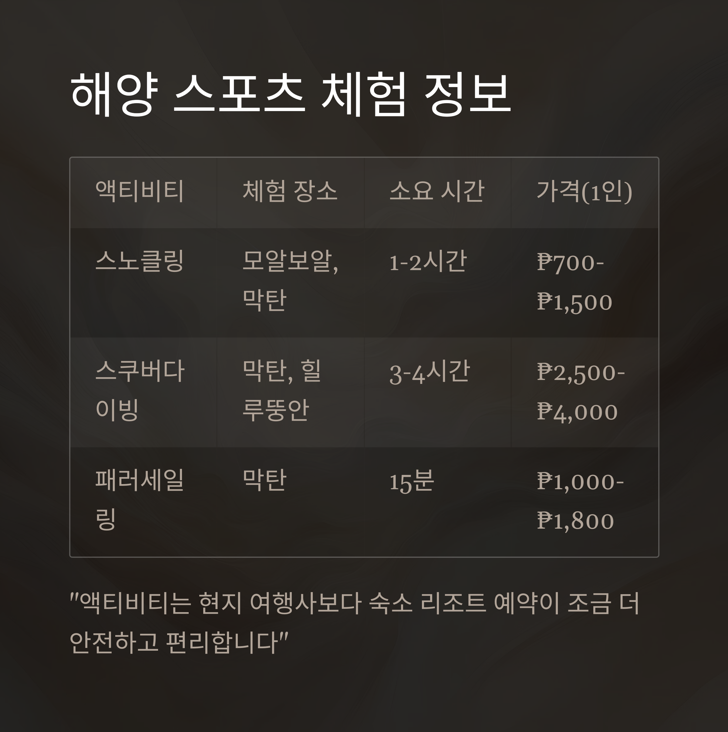 "액티비티는 현지 여행사보다 숙소 리조트 예약이 조금 더 안전하고 편리합니다"