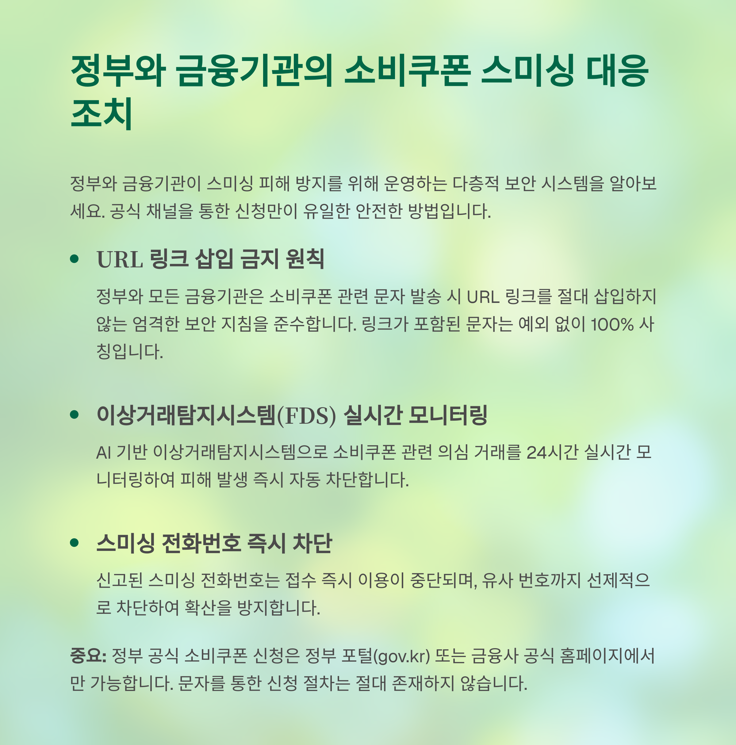 소비쿠폰 관련 이상 거래 모니터링 강화 - 스미싱 전화번호 즉시 이용 중단 조치