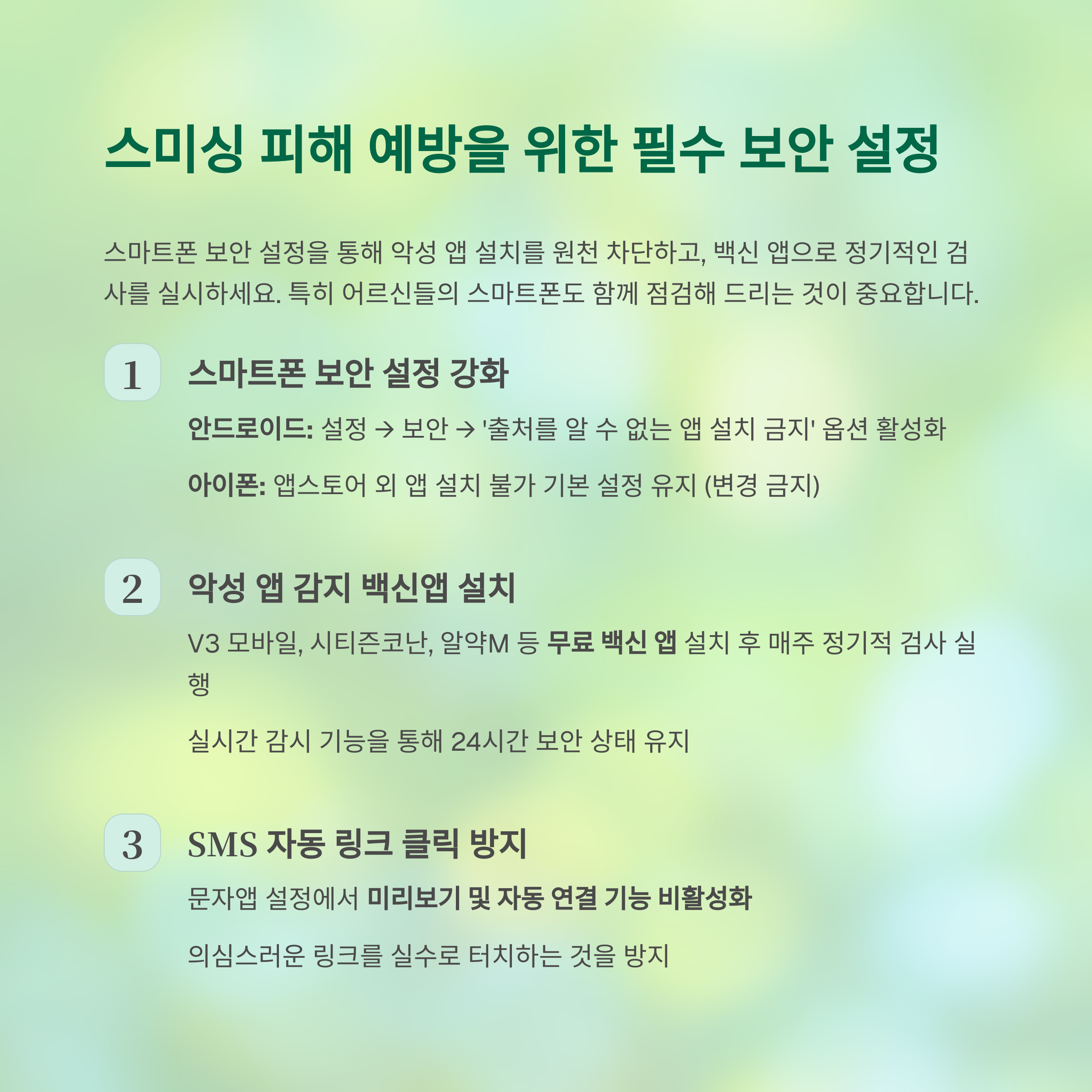 | 악성앱 설치 확인 | 모바일 백신으로 검사 후 즉시 삭제, 필요 시 공장 초기화 |