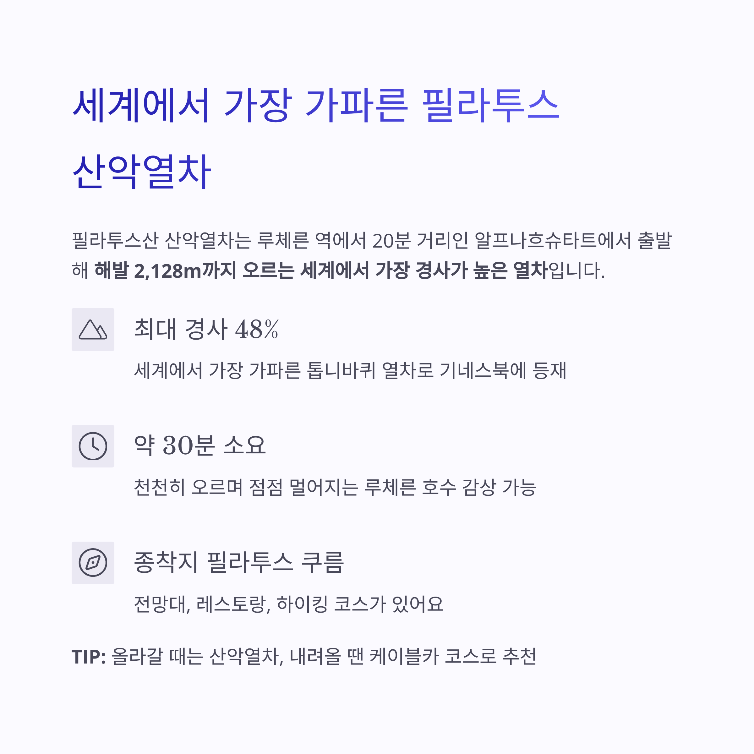 - 약 30분 소요, 천천히 오르며 점점 멀어지는 루체른 호수 감상 가능