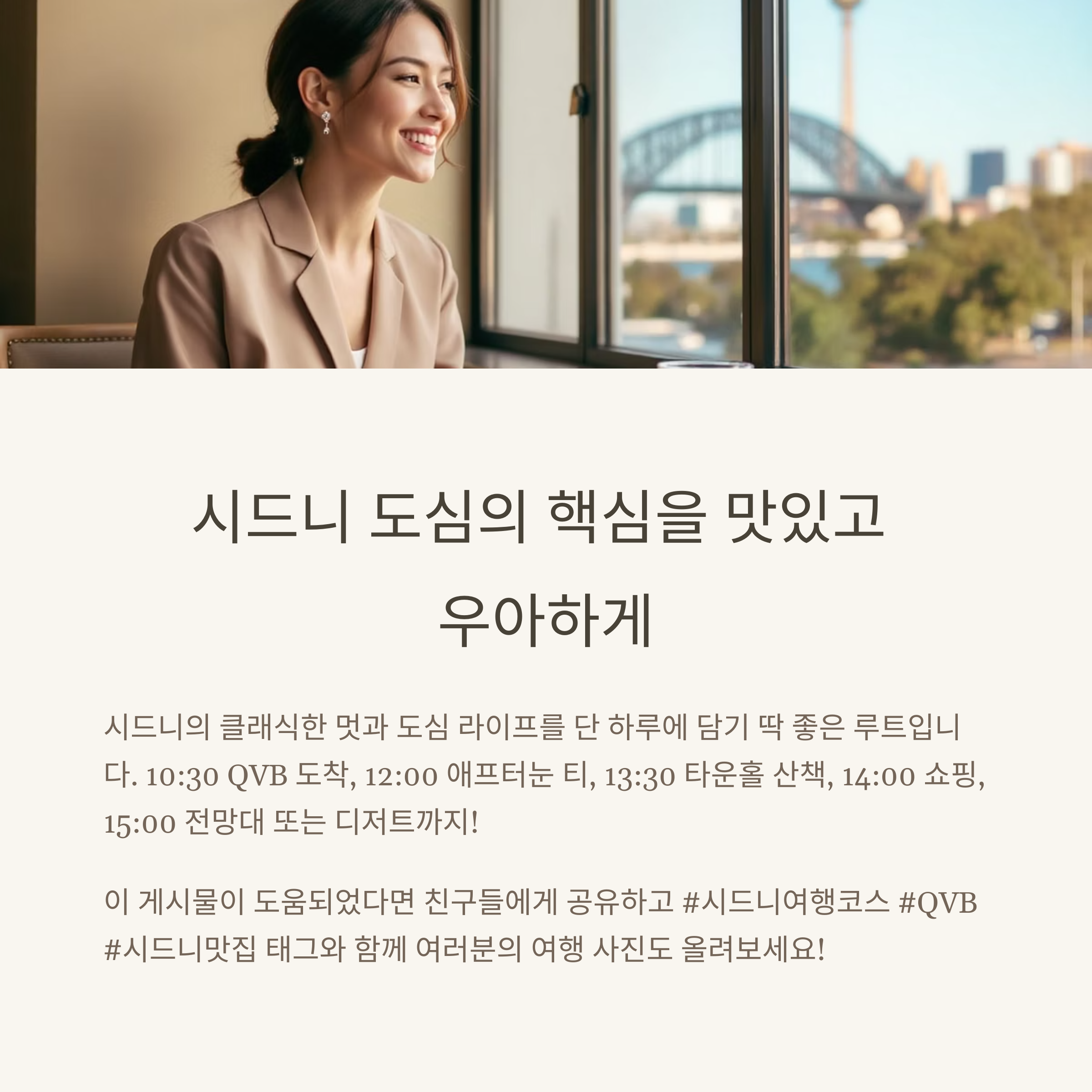 “딱 이 일정으로 시드니 도심의 핵심을 맛있고 우아하게 누릴 수 있어요.”