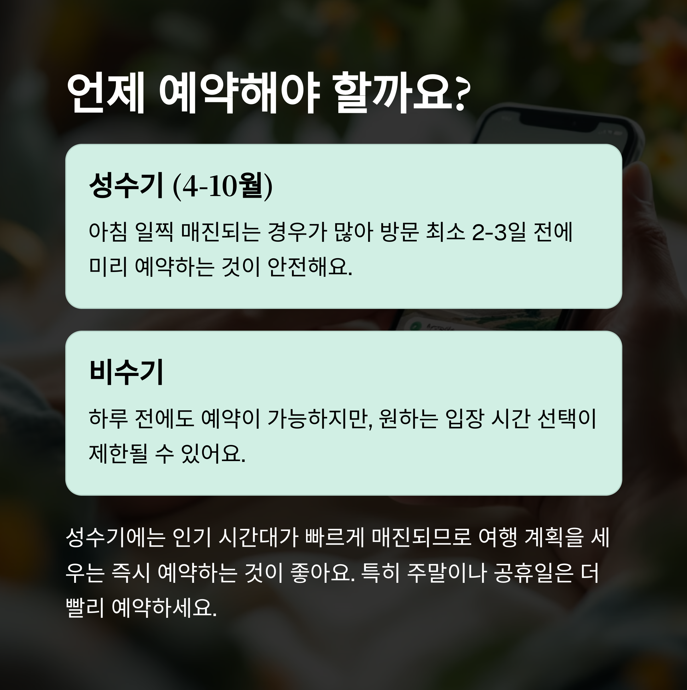 [언제 예약해야 하나요?] 성수기엔 2~3일 전, 비수기엔 하루 전도 가능