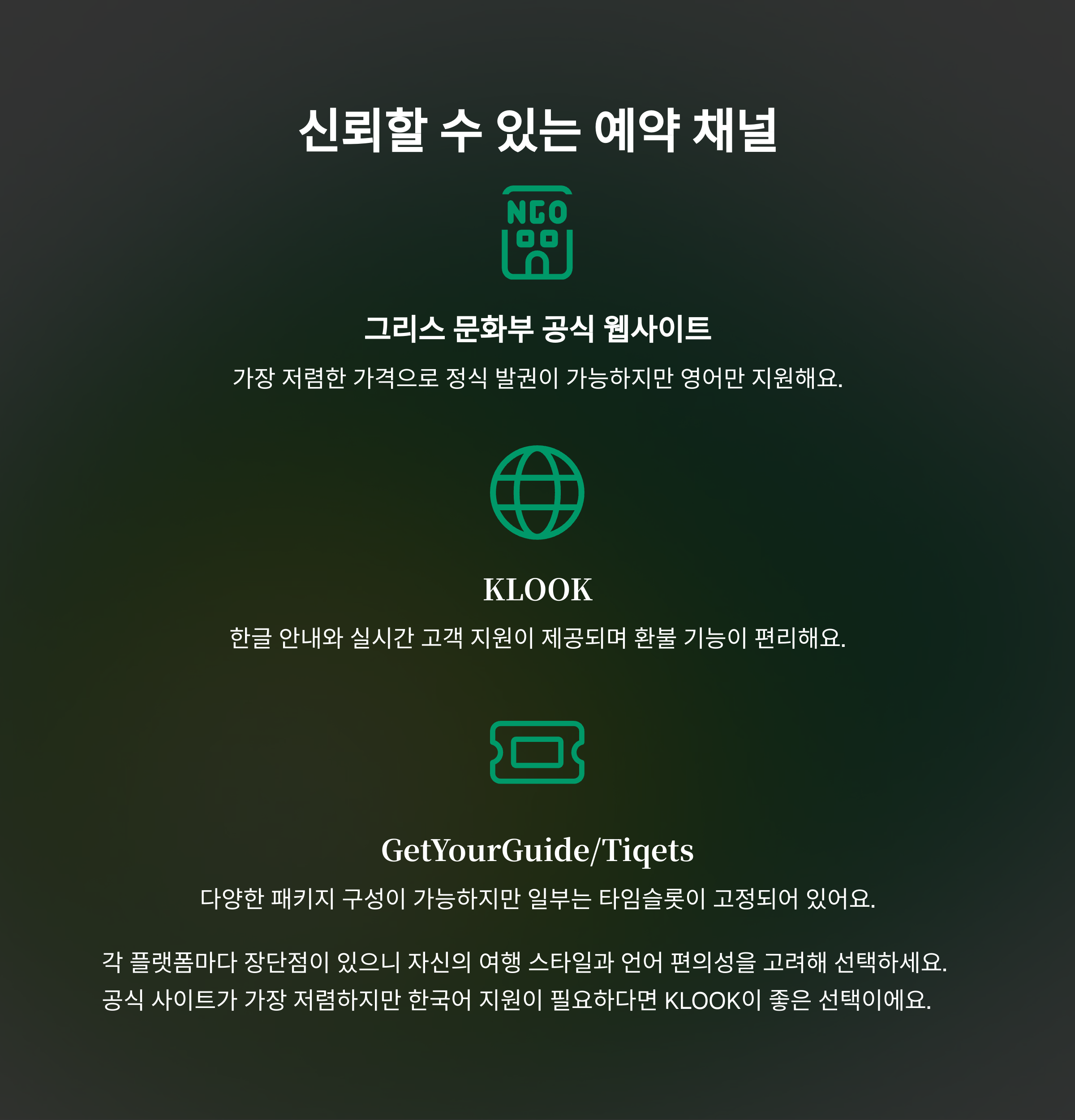 가장 신뢰할 수 있는 예약처는 그리스 문화부 공식 웹사이트예요.