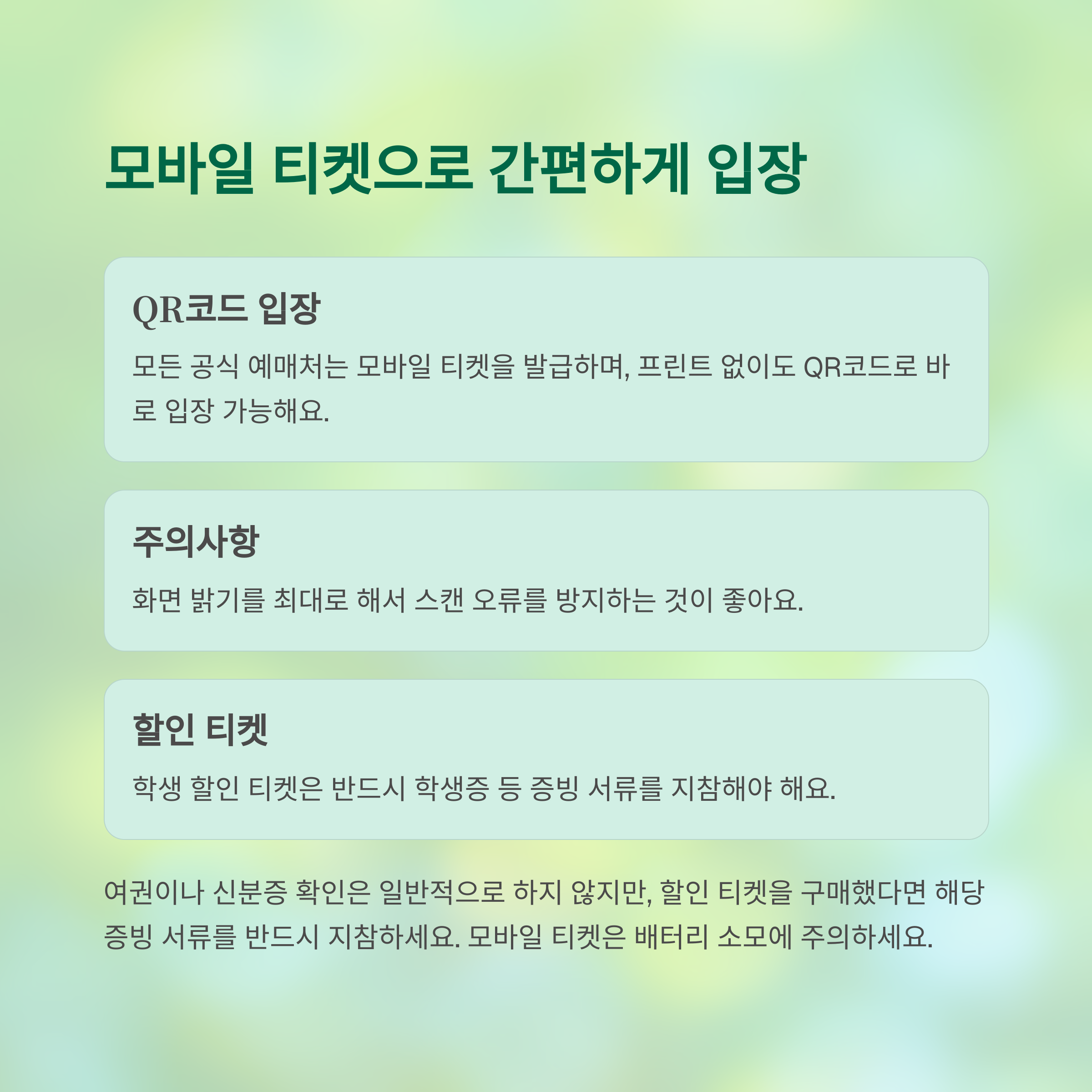 모든 공식 예매처는 모바일 티켓을 발급하며, 프린트 없이도 QR코드로 바로 입장 가능해요.