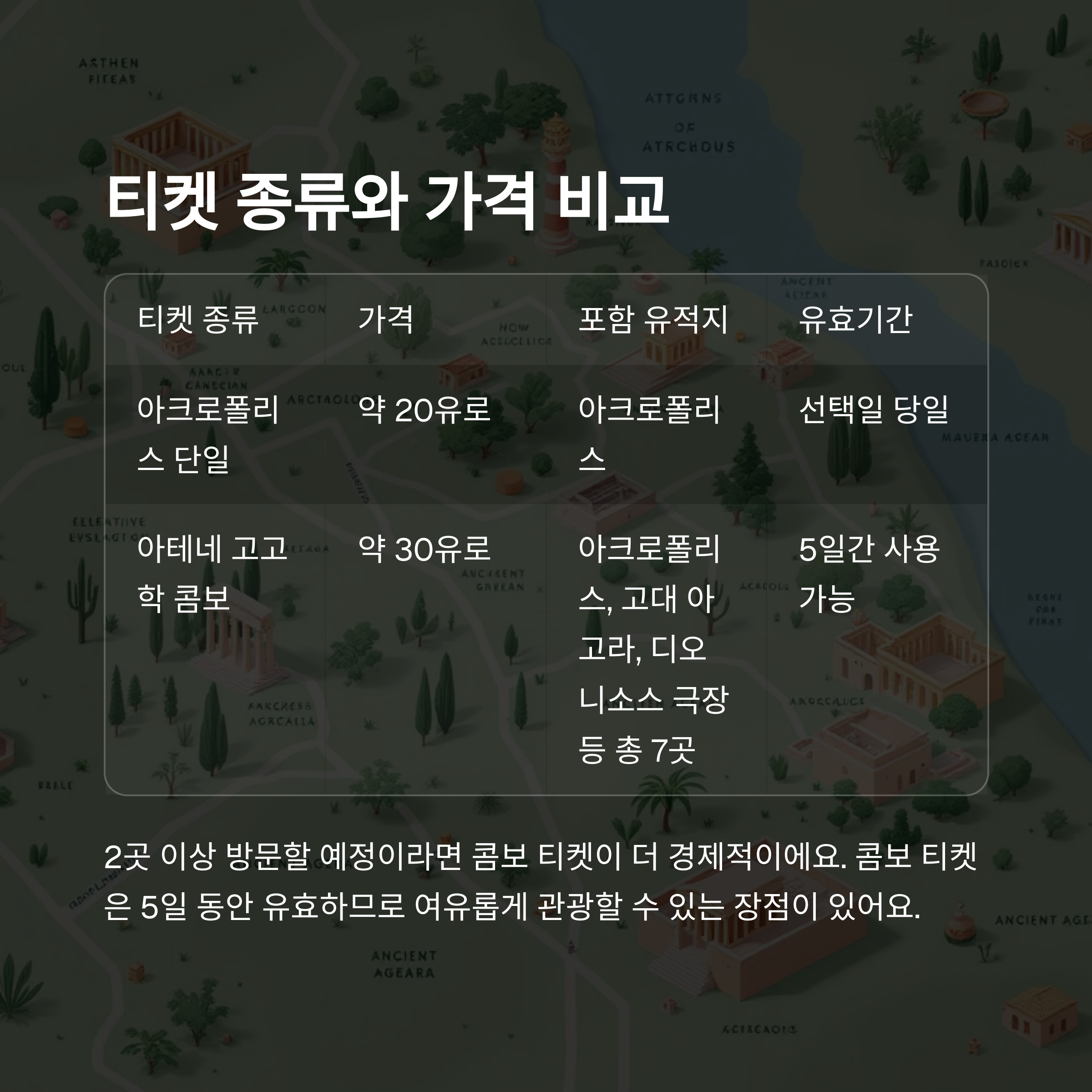 | 아테네 고고학 콤보 | 약 30유로 | 아크로폴리스, 고대 아고라, 디오니소스 극장 등 총 7곳 | 5일간 사용 가능 |
