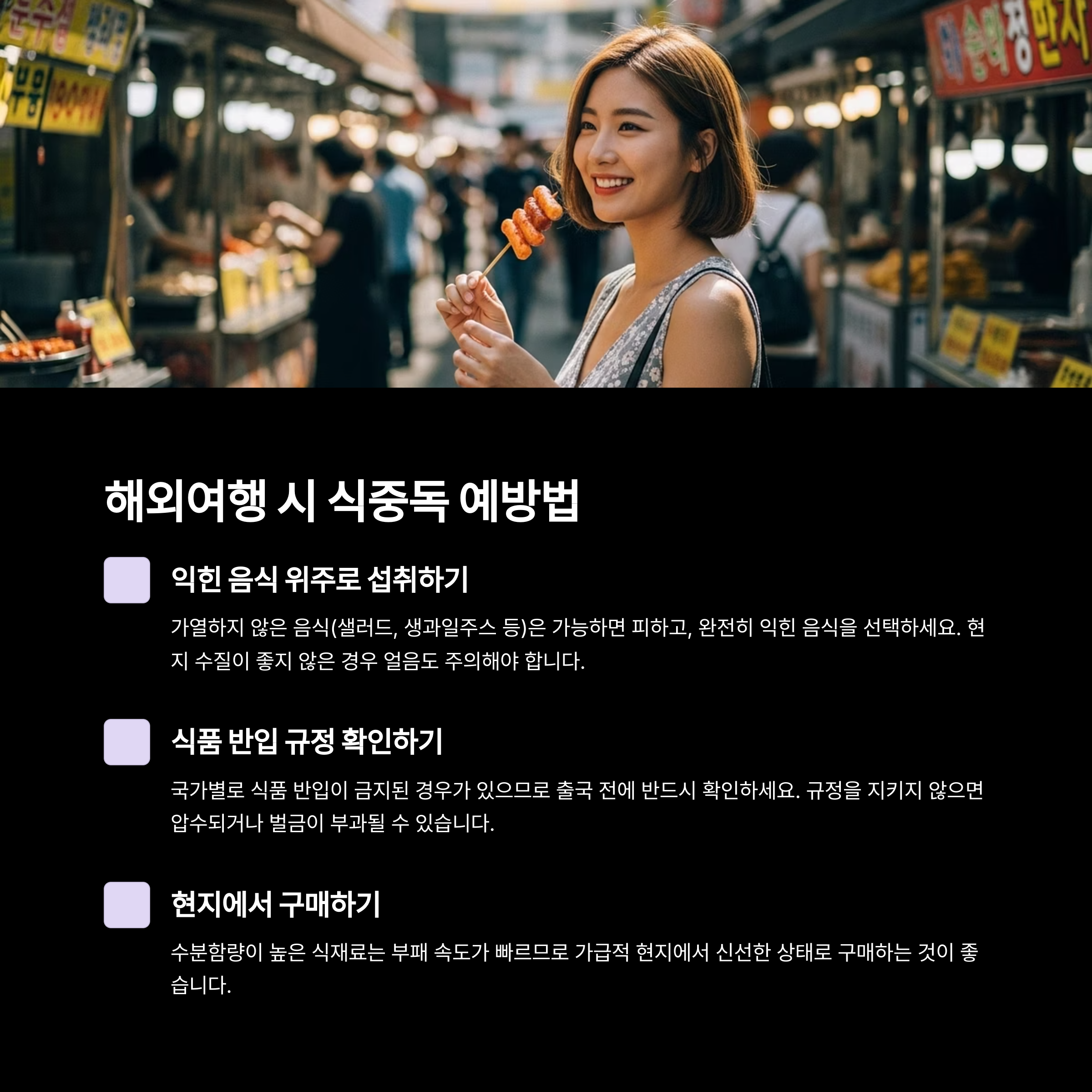 익힌 음식 위주로 섭취하세요. - 식품 반입이 금지된 국가도 있으니 출국 전 확인 필수