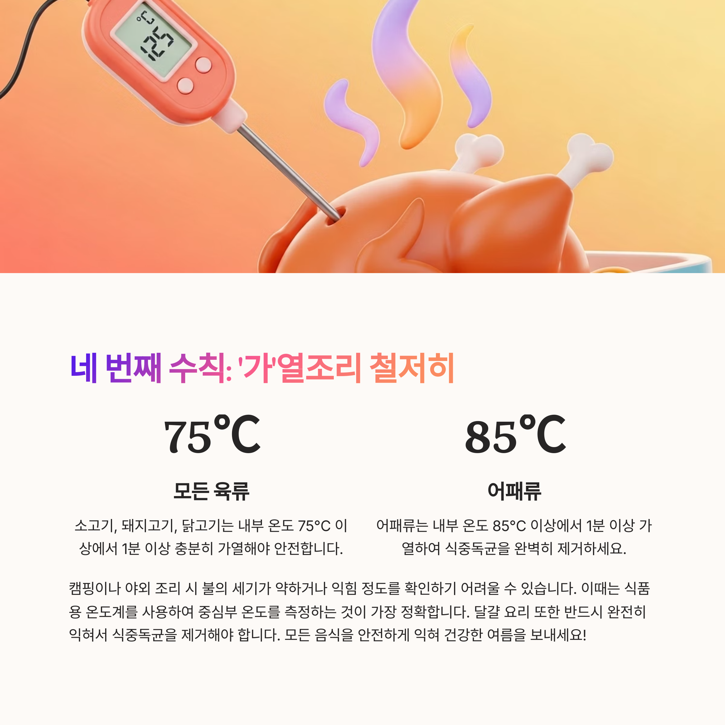- 소고기, 돼지고기, 닭고기: 75℃ 이상 1분 이상