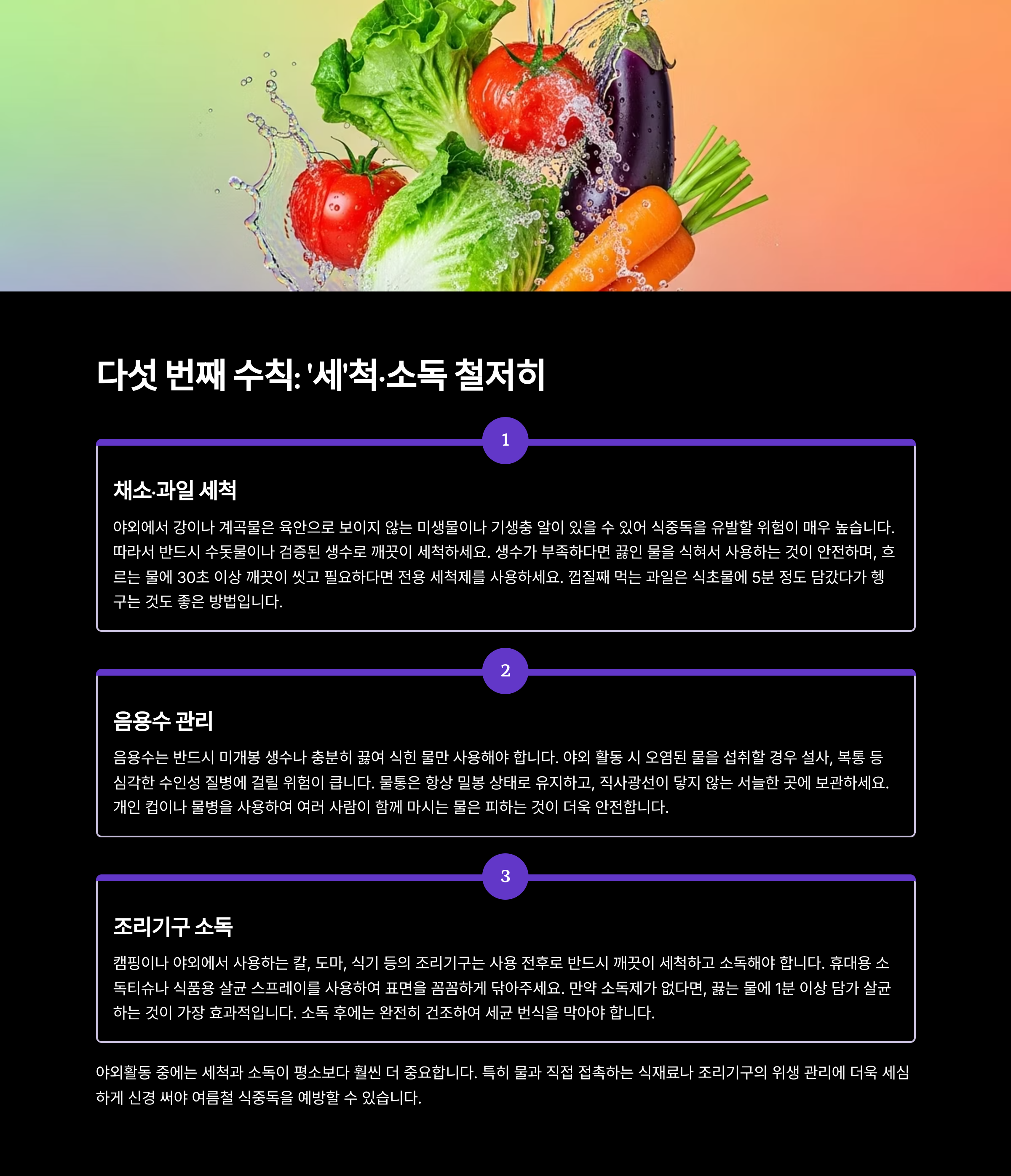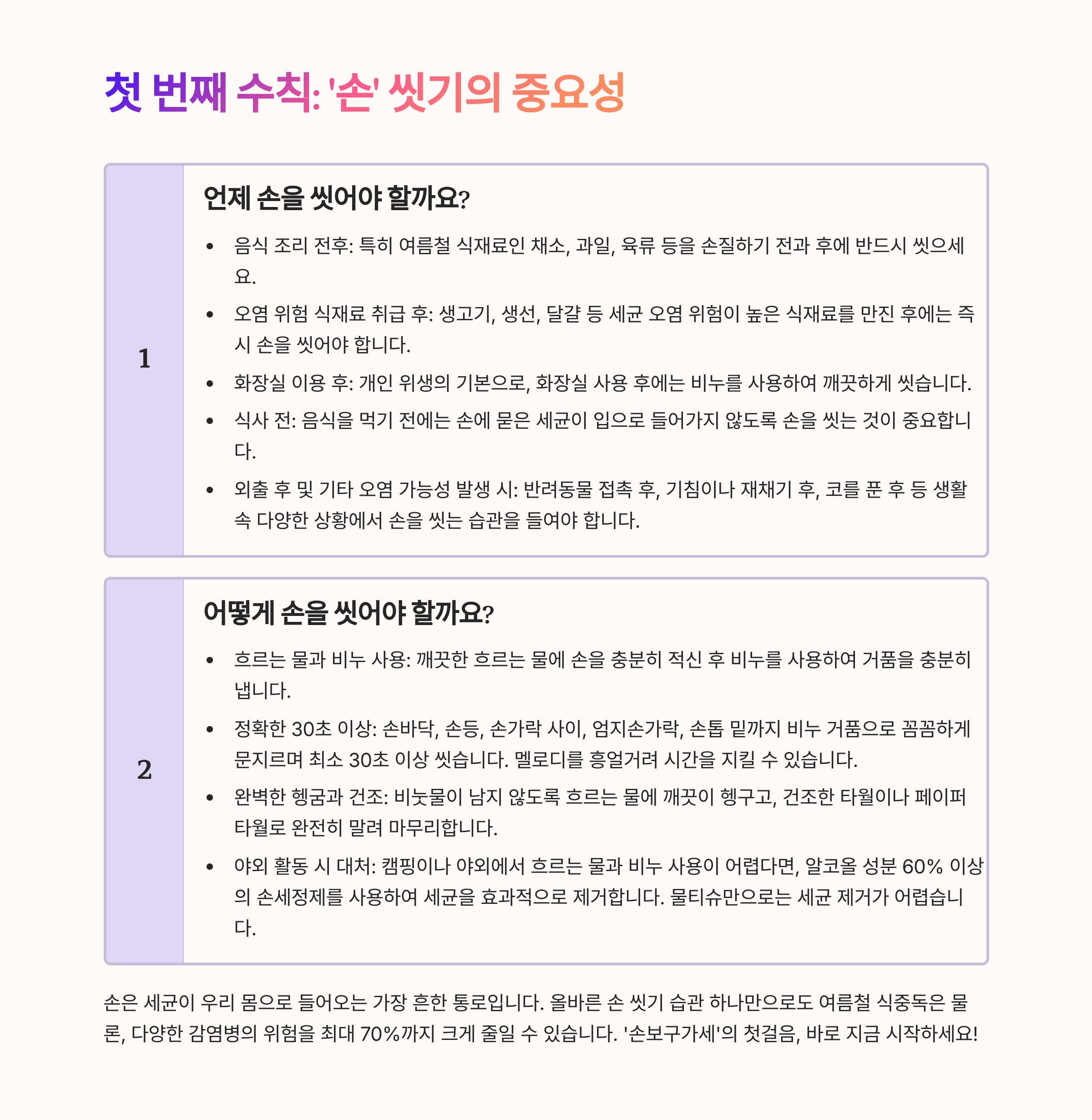 | 세 | 세척·소독: 채소·과일은 수돗물로 세척, 기구는 조리 전후 철저히 소독 |