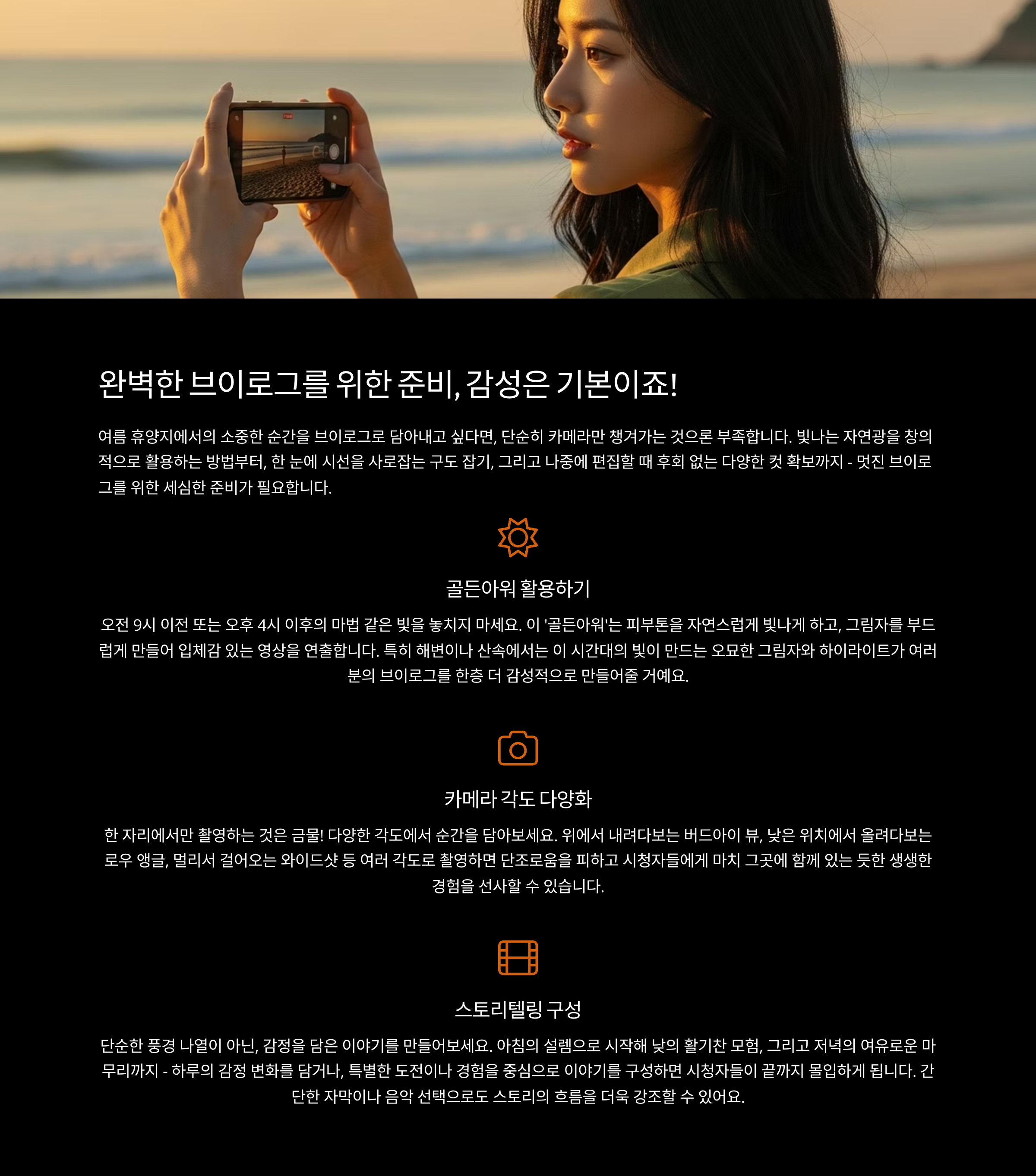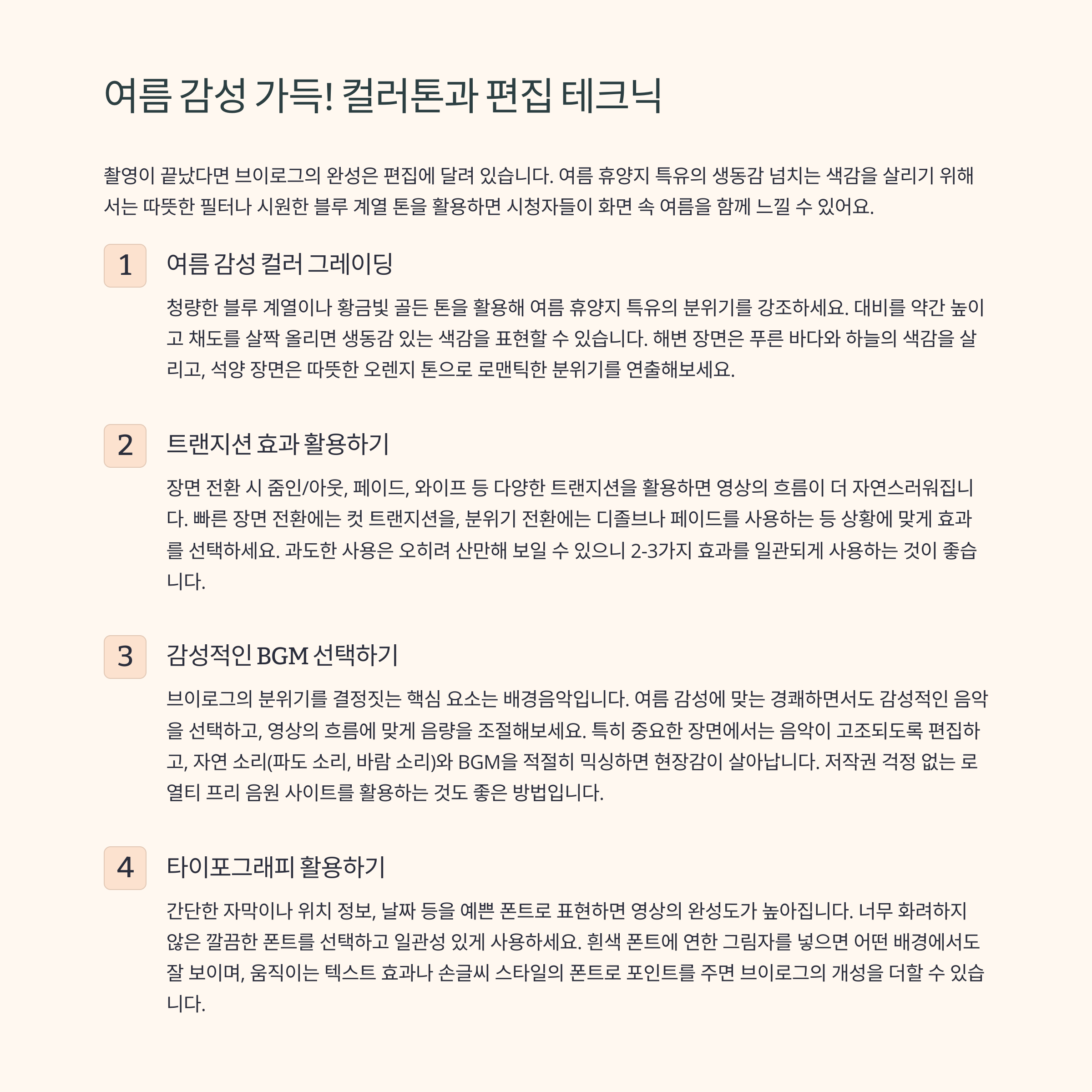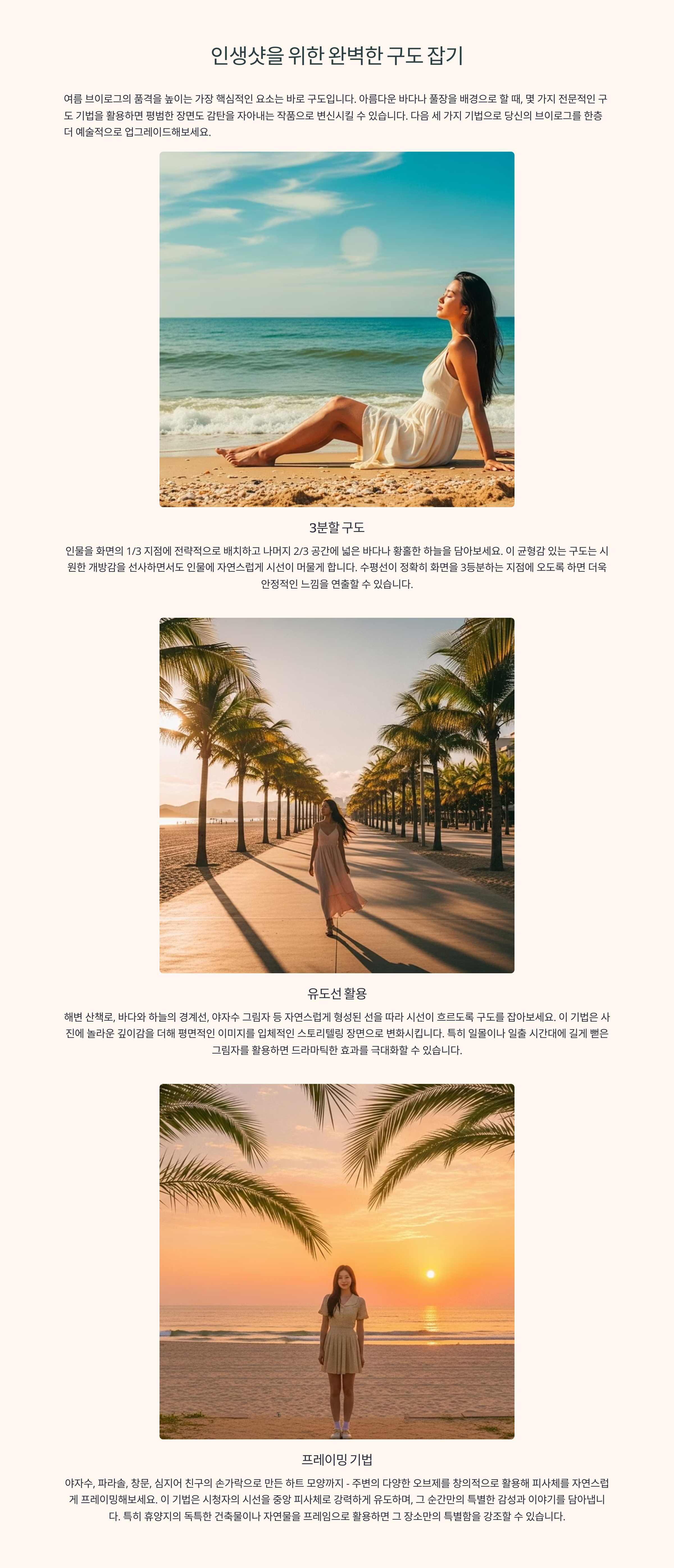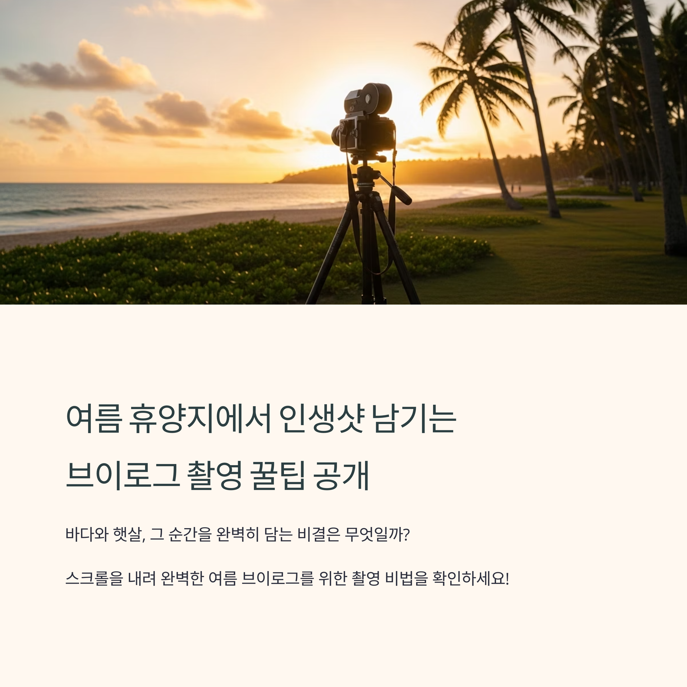 여름 휴양지에서의 순간을 브이로그로 남기고 싶다면, 단순히 카메라만 들고 간다고 좋은 결과물이 나오지는 않습니다. 자연광을 활용한 촬영 팁부터, 인생샷을 담을 수 있는 구도, 편집을 고려한 컷 구성까지 세심한 전략이 필요합니다. 이번 글에서는 휴양지에서 브이로그를 더 감성 있게, 더 예쁘게 찍는 방법을 소개해드립니다.