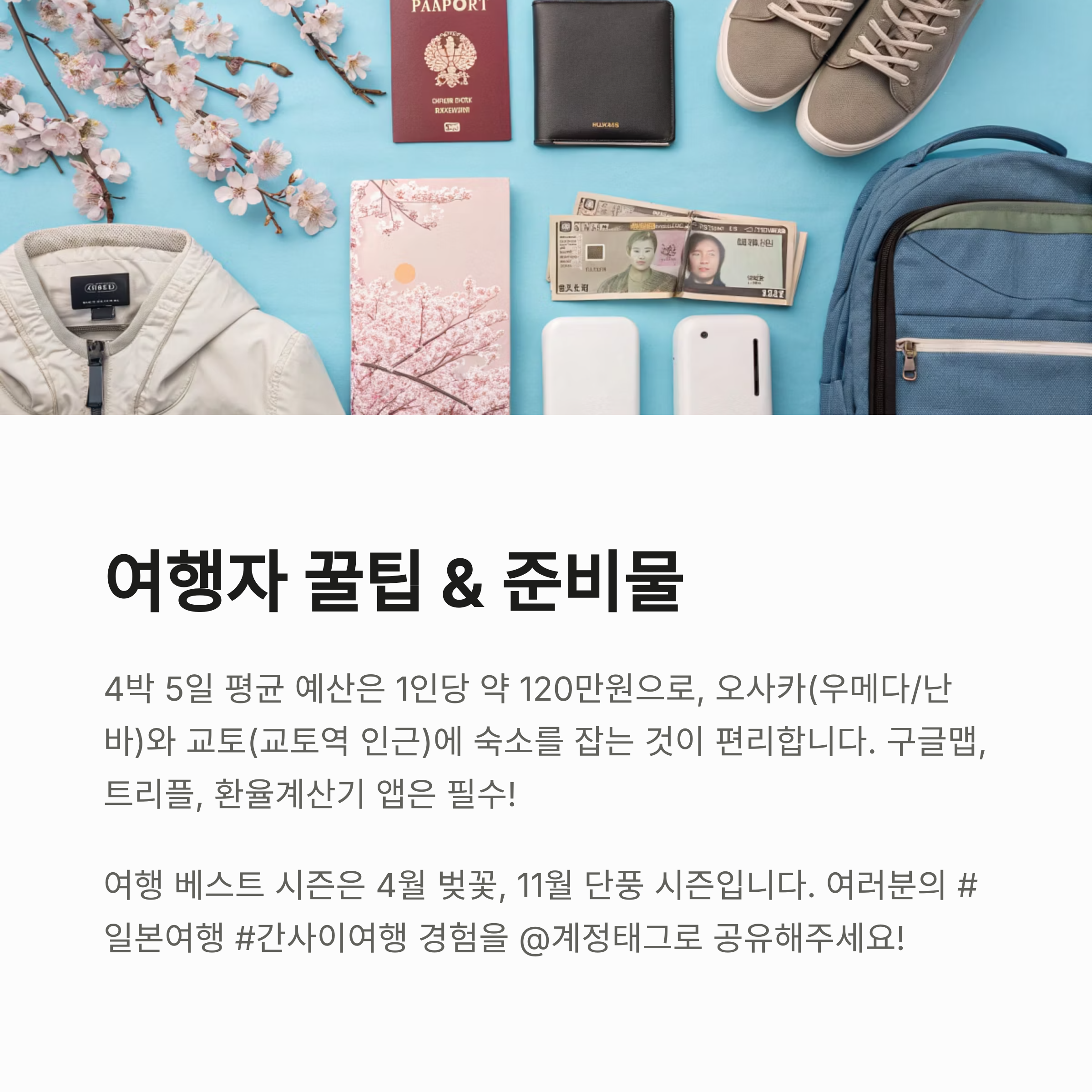 오사카, 교토, 나라는 도시마다 전혀 다른 감성을 선사합니다. 한 여행 안에 세 도시의 정취가 어우러진다는 점이 이 루트의 가장 큰 장점입니다. 후회 없는 감성 여행이 되길 바랍니다.